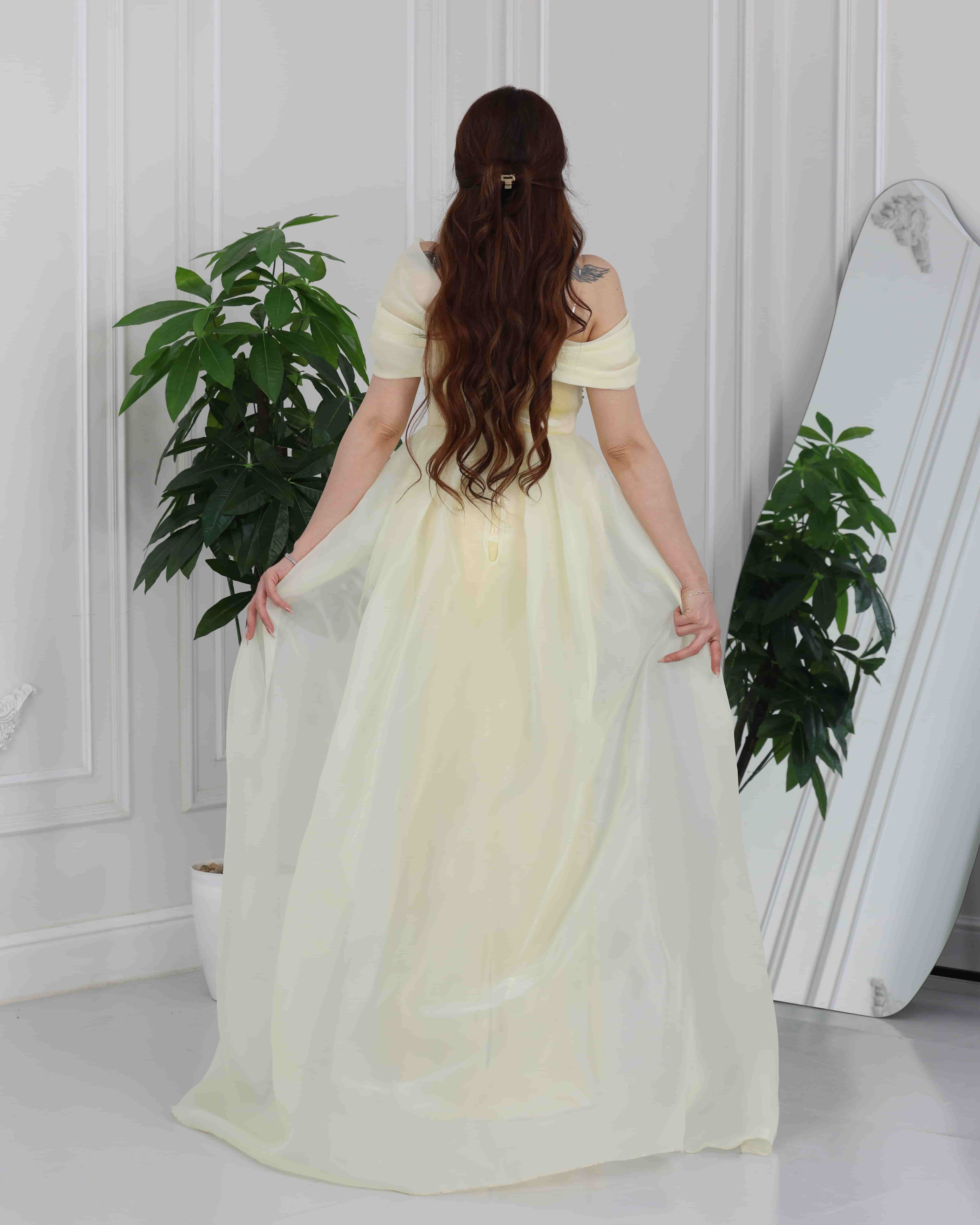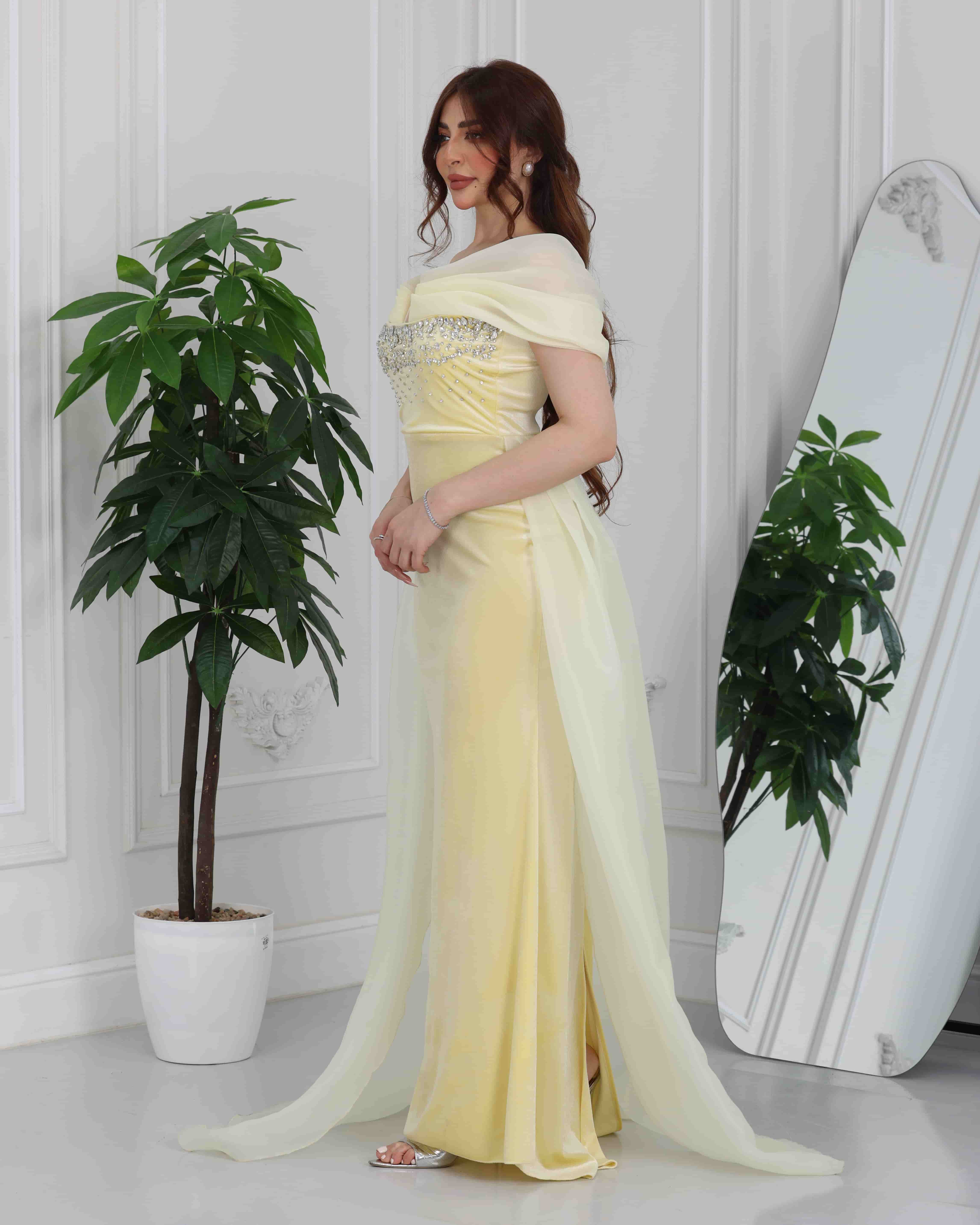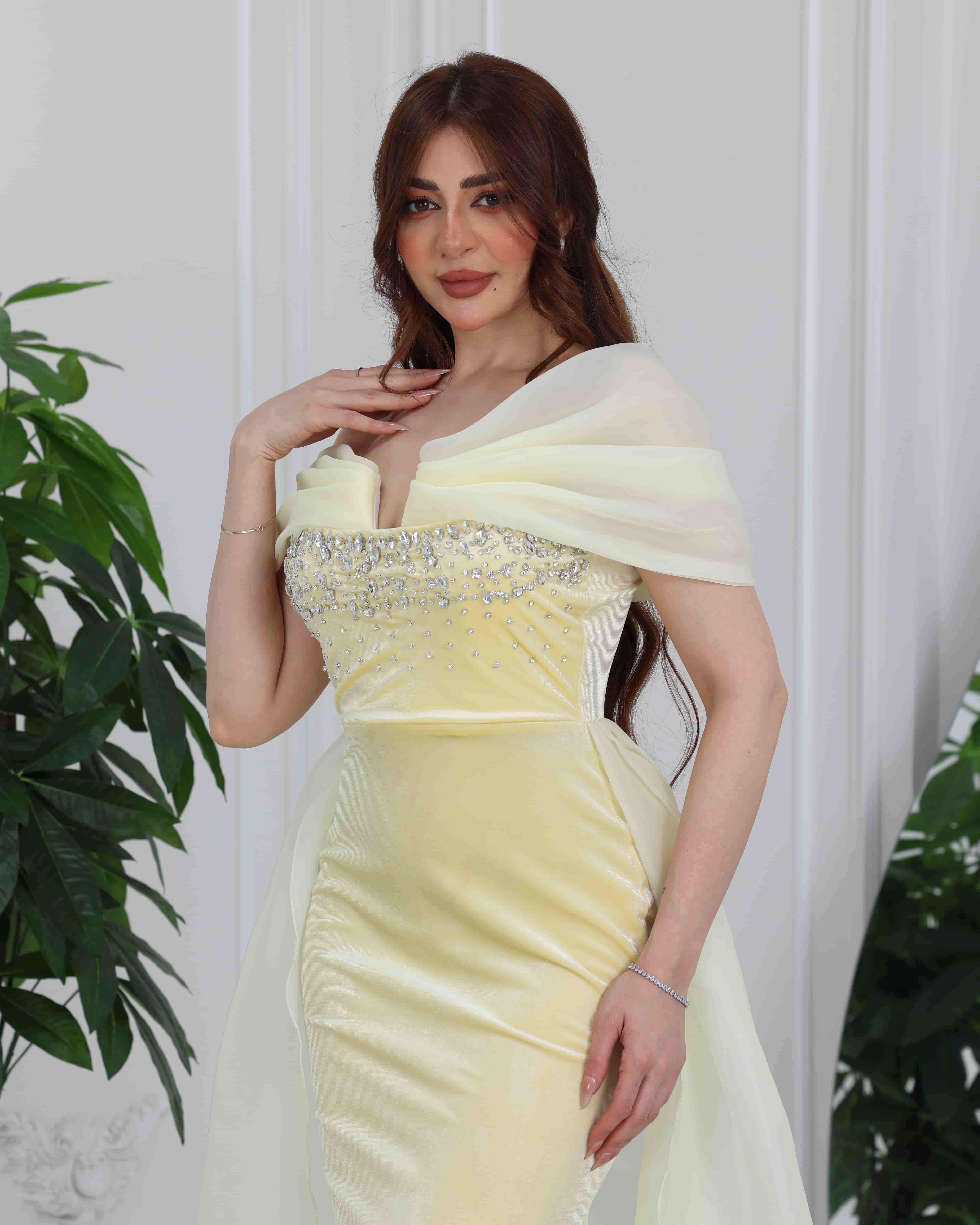 yellow velvet crystal gown – off shoulder evening dress – luxury khaliji fashion – formal elegant wear