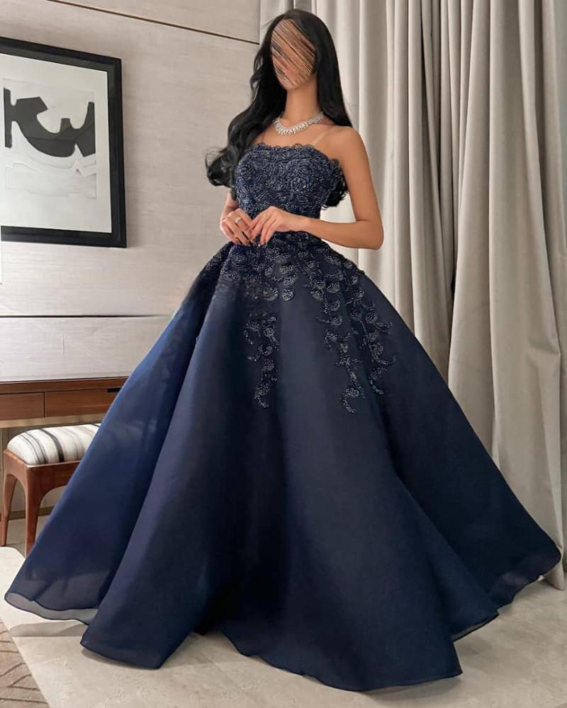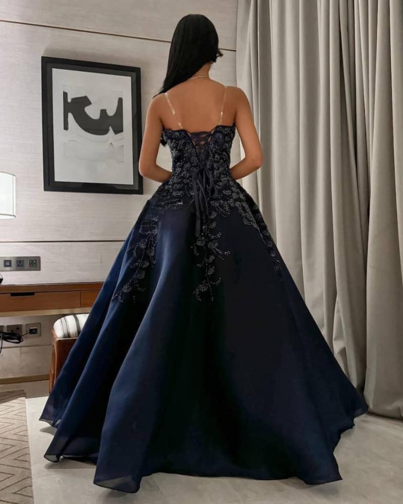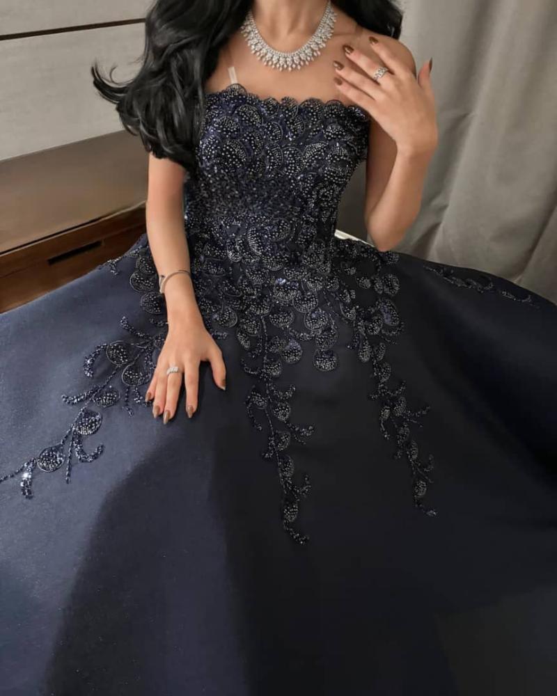 ✨ فستان الهيبة الملكية هو عنوان الأناقة والرقي في كل سهرة، حيث يتميز بلونه الكحلي العميق الذي يفيض فخامة وجاذبية.