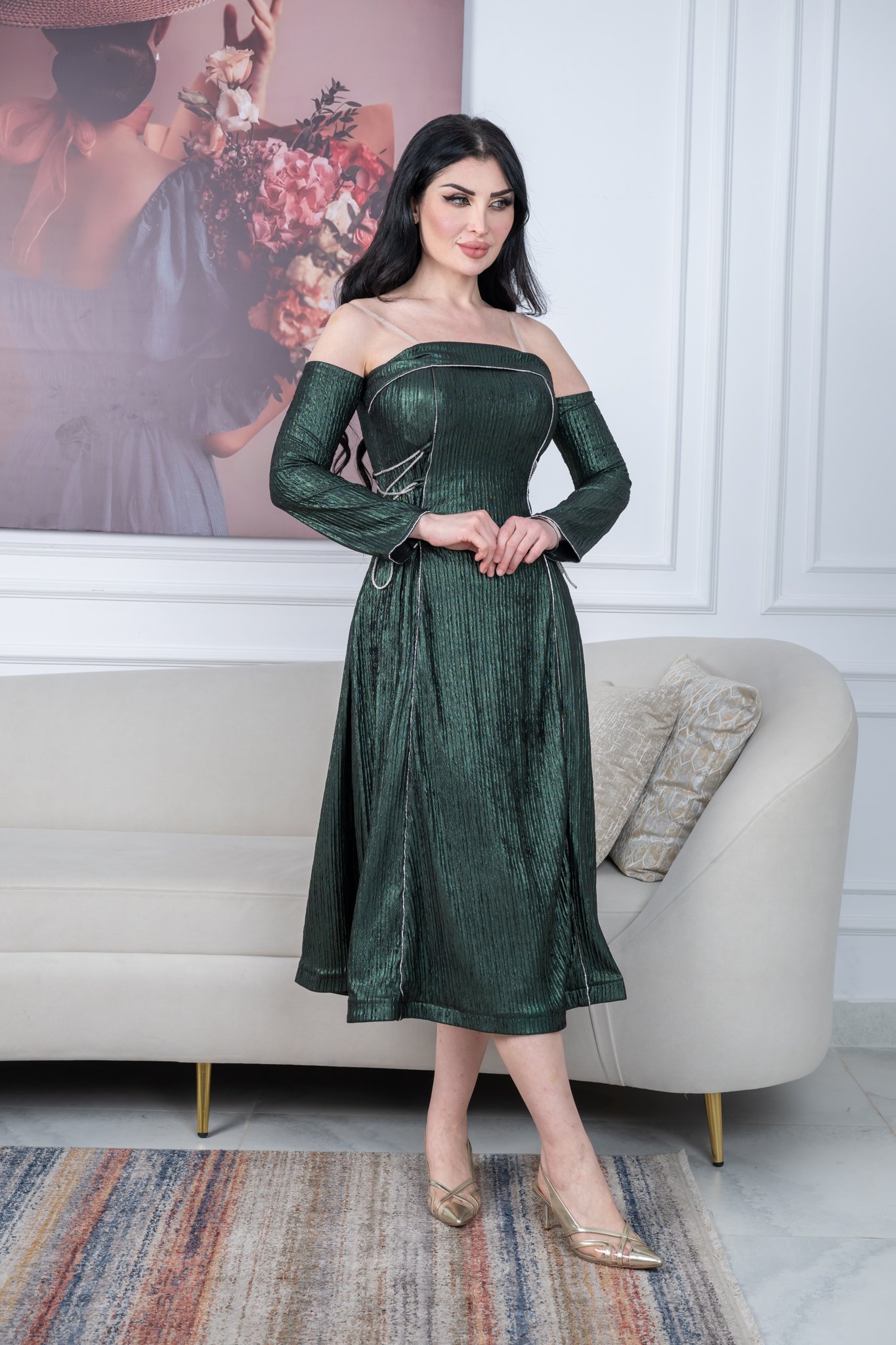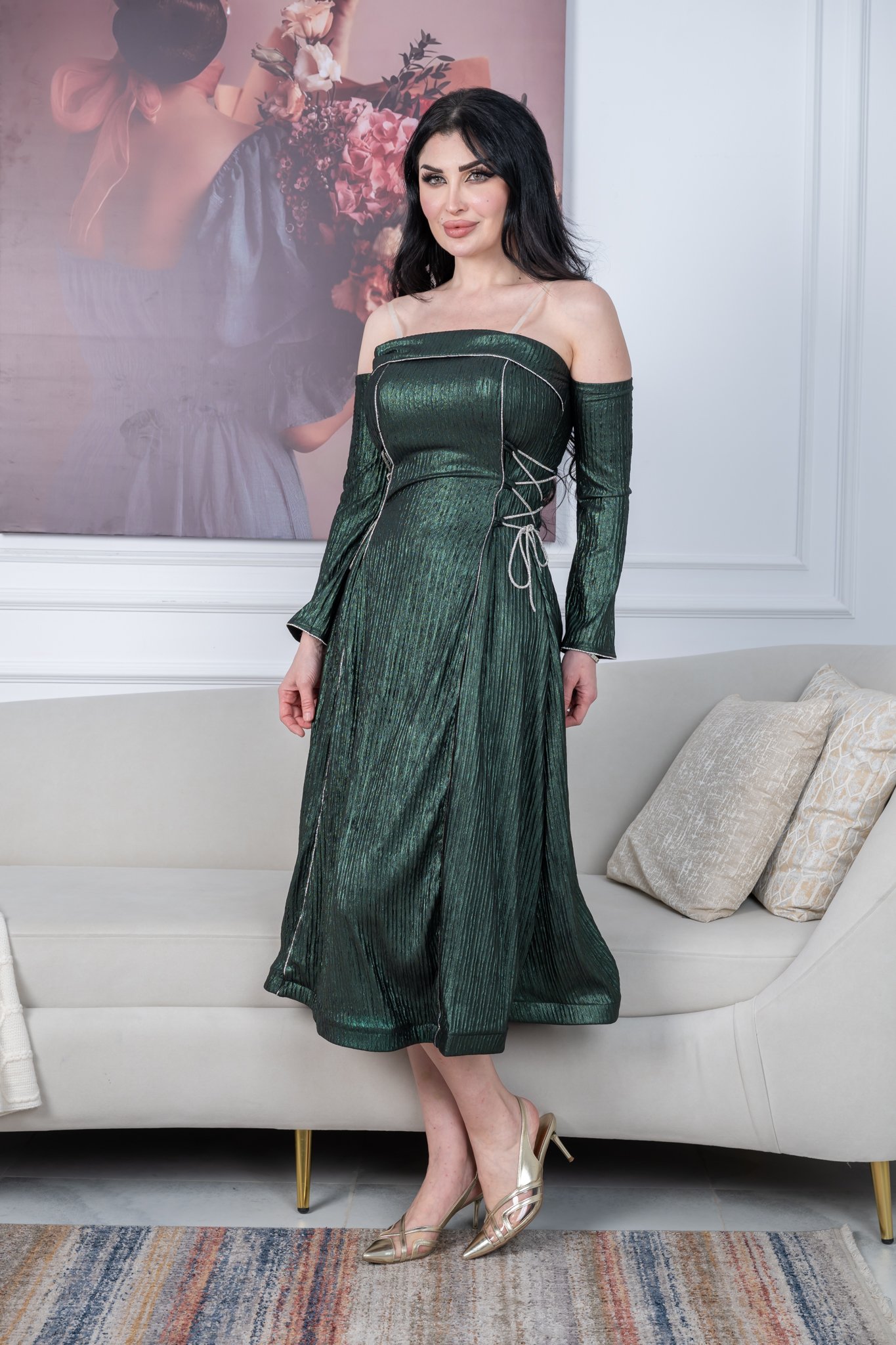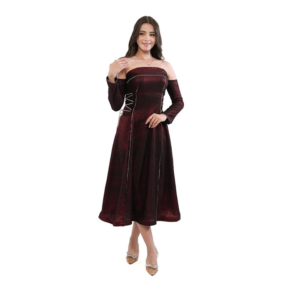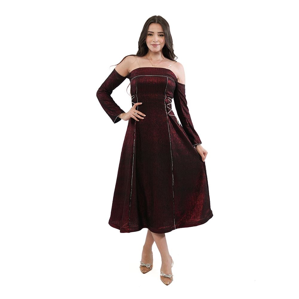 فستان سهرة ميدي لامع بلون زيتي أو عودي، مثالي لحفلات المساء، المناسبات الاجتماعية، سهرات العيد، وجلسات التصوير الخاصة. تصميمه الجذاب يناسب الأجواء الشتوية أو الأماكن المكيفة في الصيف، ويليق بالذوق الخليجي.