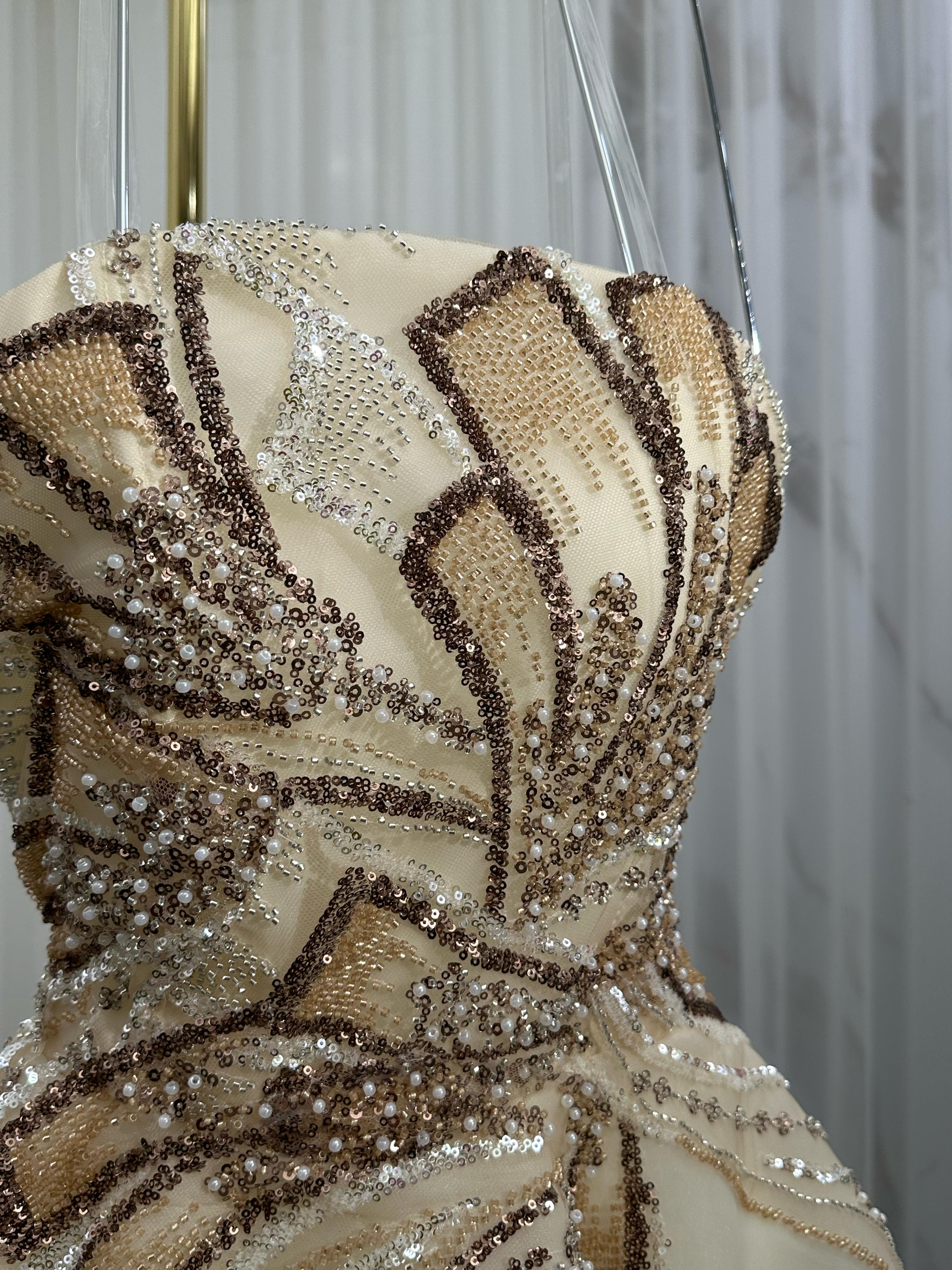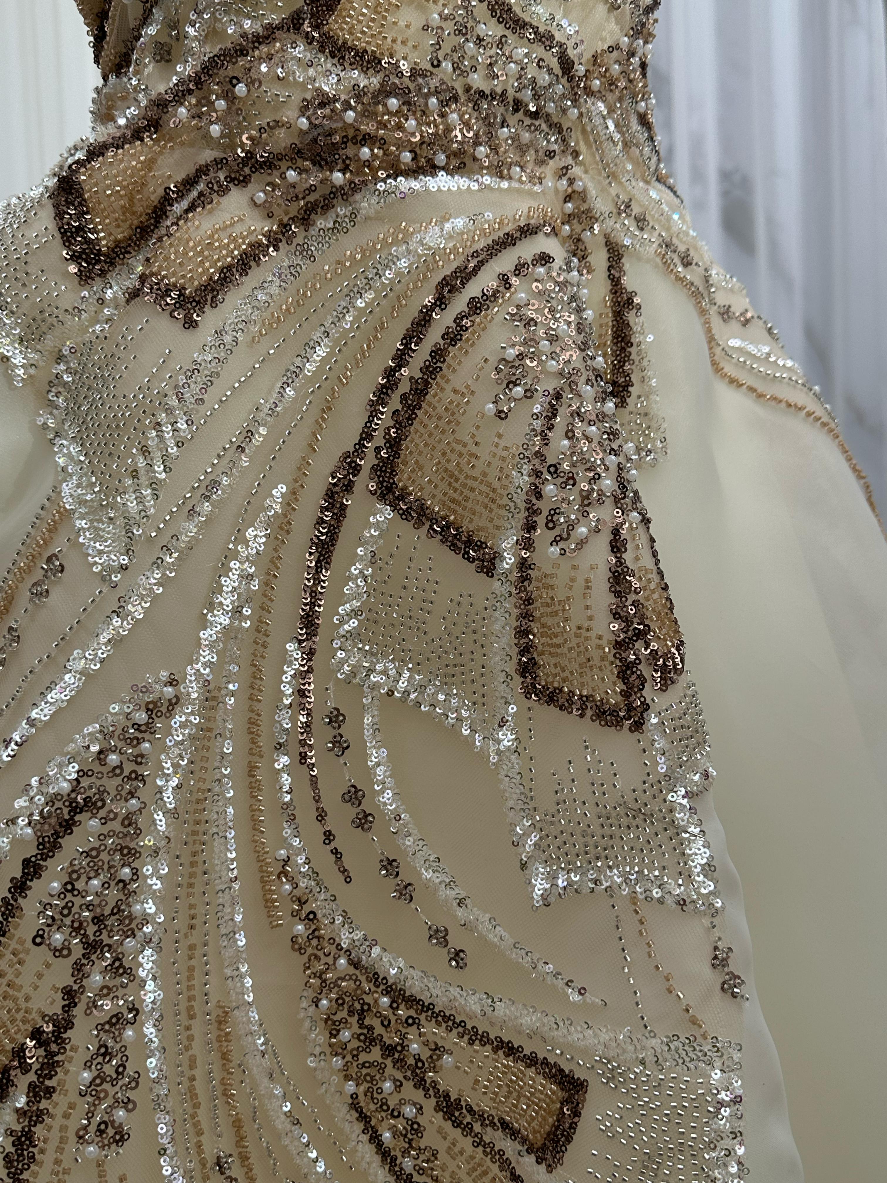 • التزيين: تطريز بخيوط ذهبية وأحجار براقة بتفاصيل ملكية