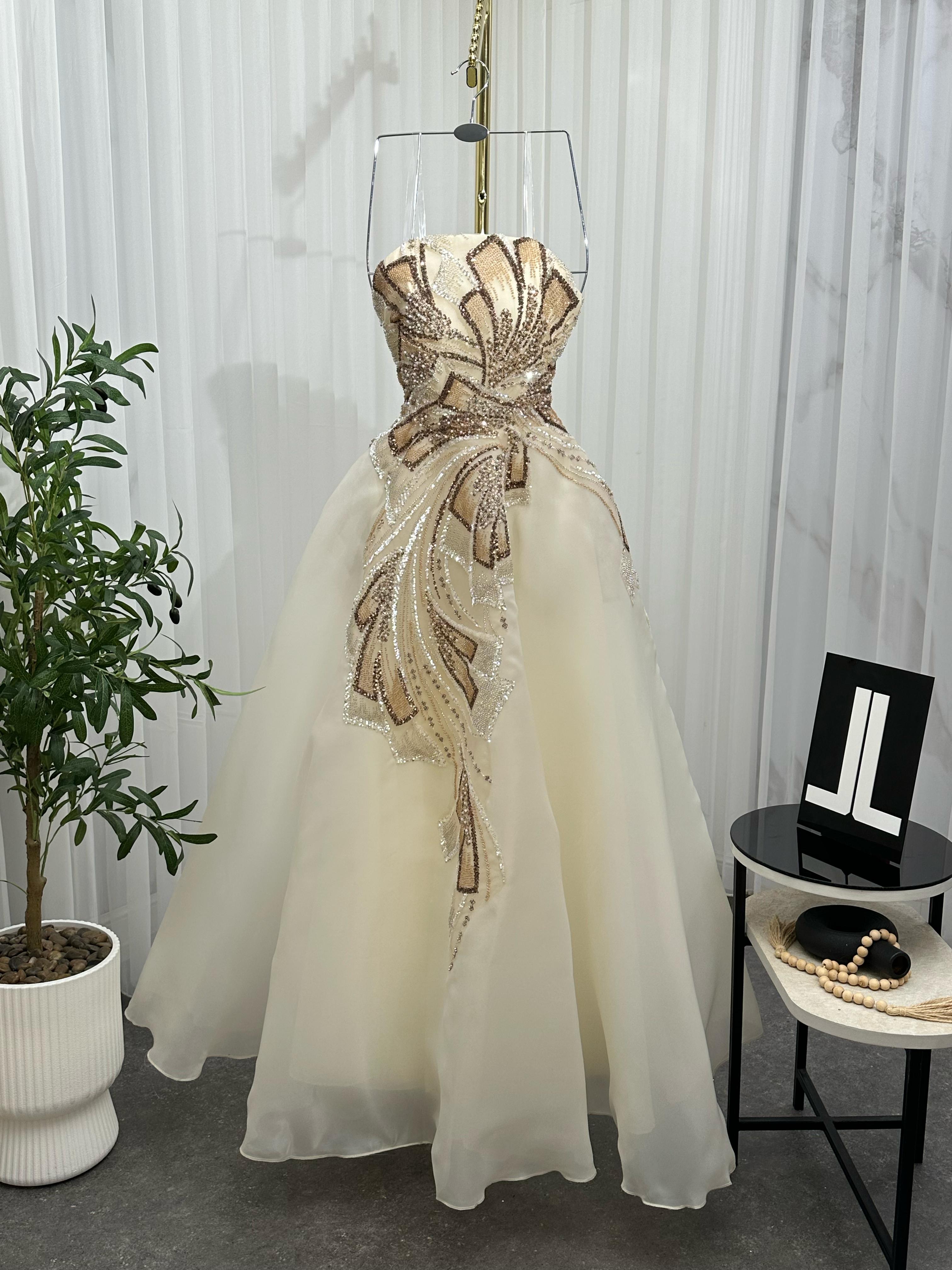 فستان سهرة طويل من قماش الجازار الفاخر بقصّة ملكية تمنح إطلالة فخمة تعكس الأناقة والأنوثة. يتميز بتطريز متقن بخيوط ذهبية وأحجار لامعة تضفي لمسة من الفخامة على الجزء العلوي، بينما ينسدل القماش بانسيابية ناعمة ليمنحك قوامًا ممشوقًا وإطلالة راقية مستوحاة من القصور الملكية. الأكمام قصيرة ومطرزة بدقة لتضفي لمسة فاخرة من دون إثقال التصميم.