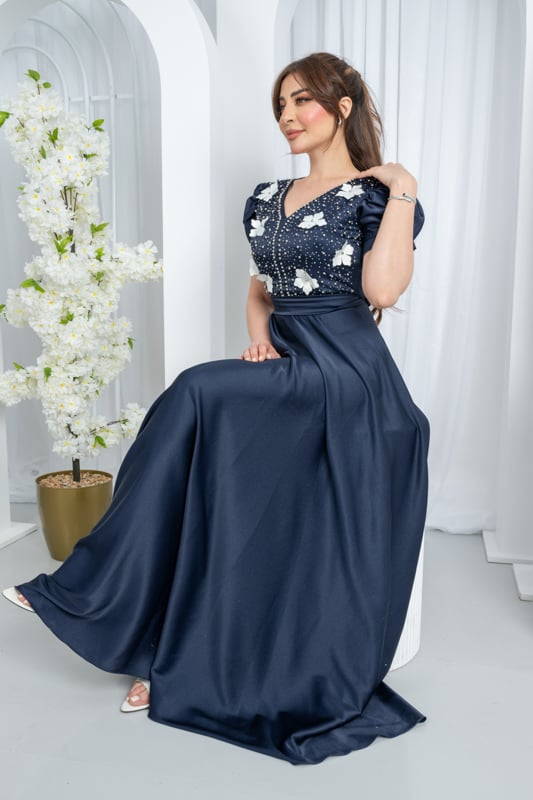 ✨ فستان فاخر يتميز بتطريزات بيضاء ناعمة تحاكي قطرات الندى فوق الأزهار، مما يمنحكِ إشراقة ساحرة.