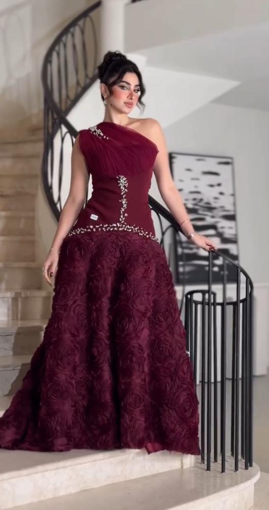 فستان سهرة باربي عنابي بتطريز فاخر وقماش ورود كلوش 5 متر، تصميم كتف واحد فاخر مثالي للمناسبات الملكية والسهرات الرسمية.