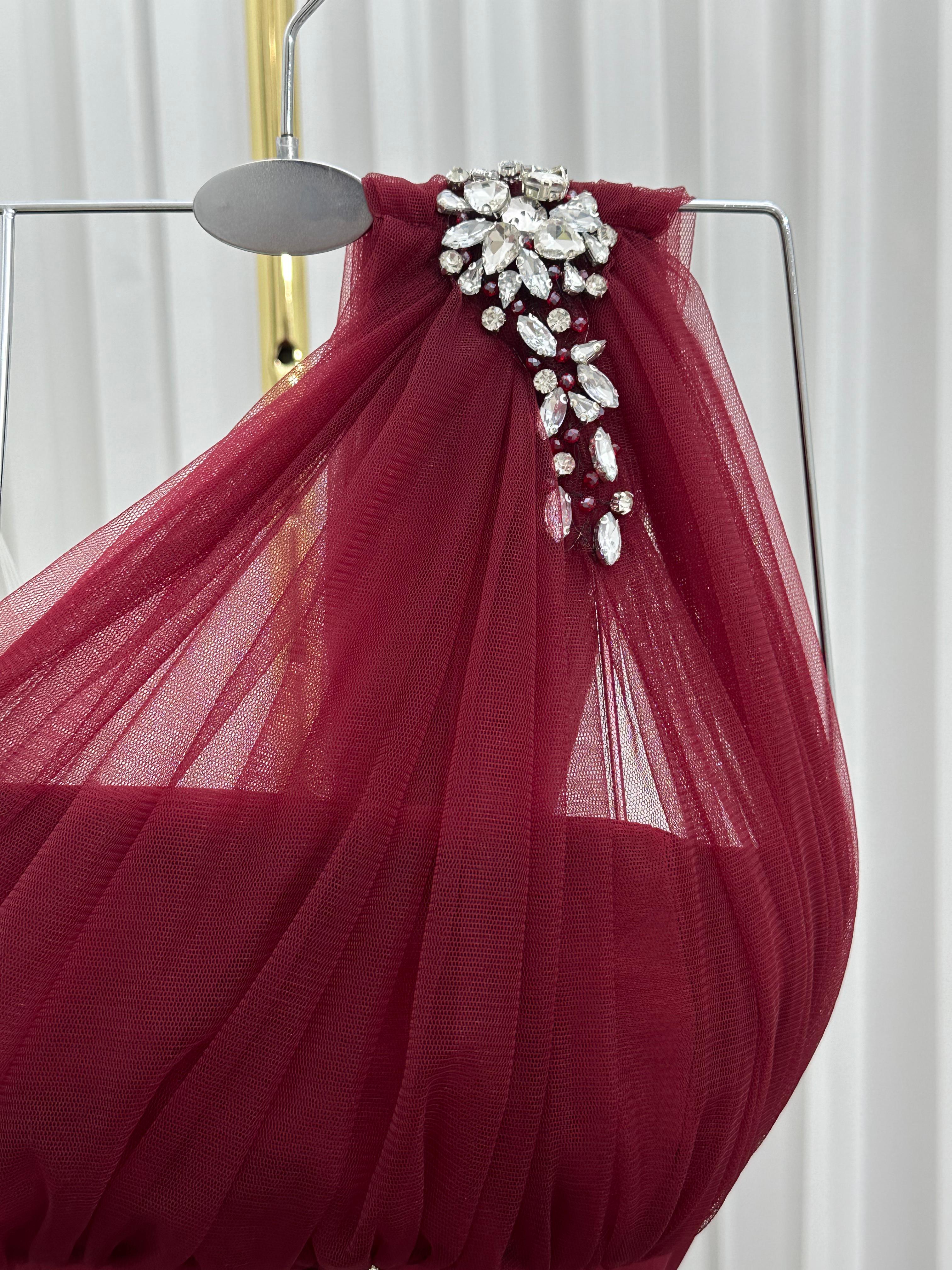 الأكمام: بدون أكمام – كتف واحد بتفصيل تل مزموم مزين بحجر فاخر