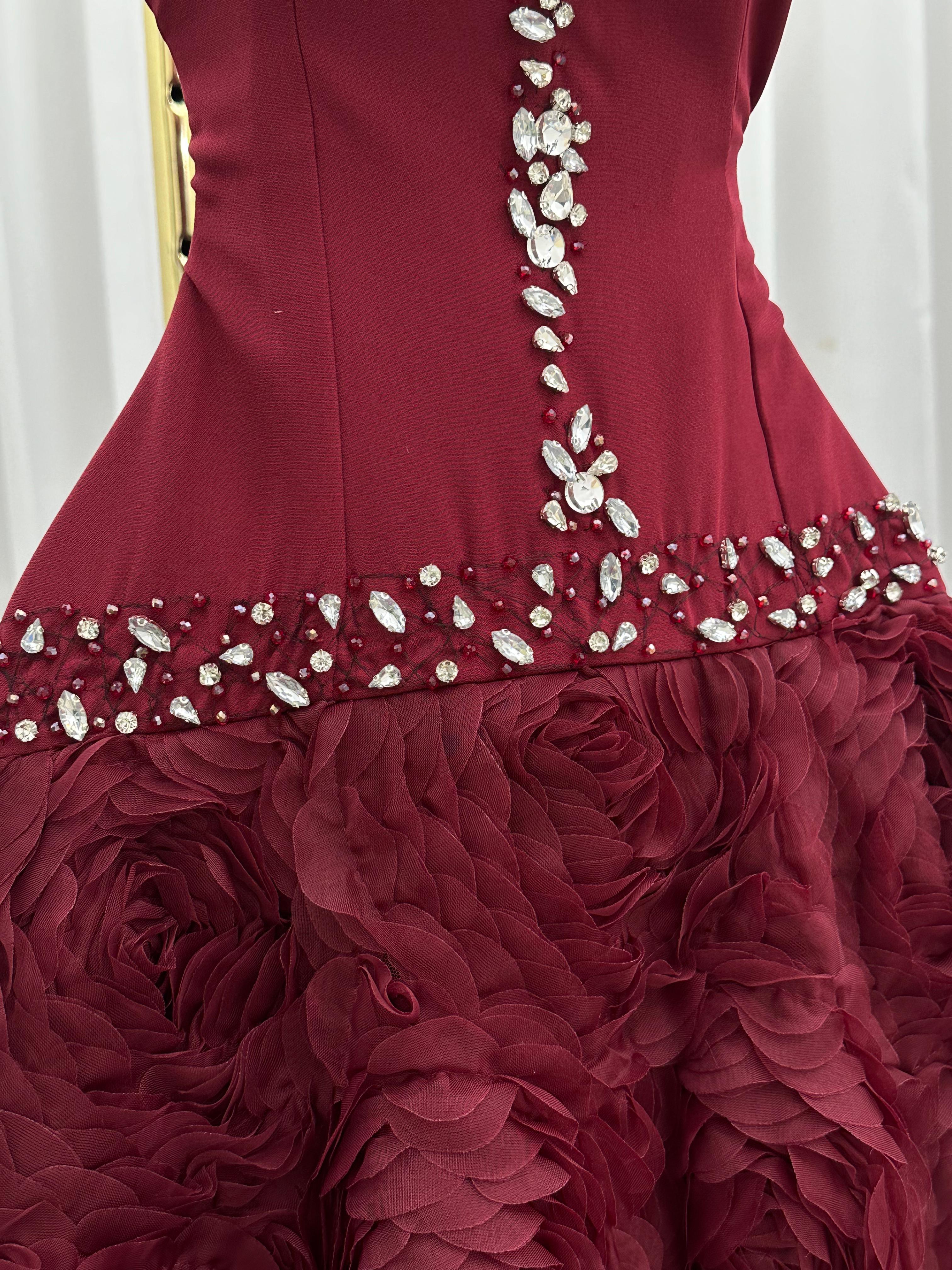 فستان باربي عنابي بتطريز فاخر وتنورة ورود كلوش