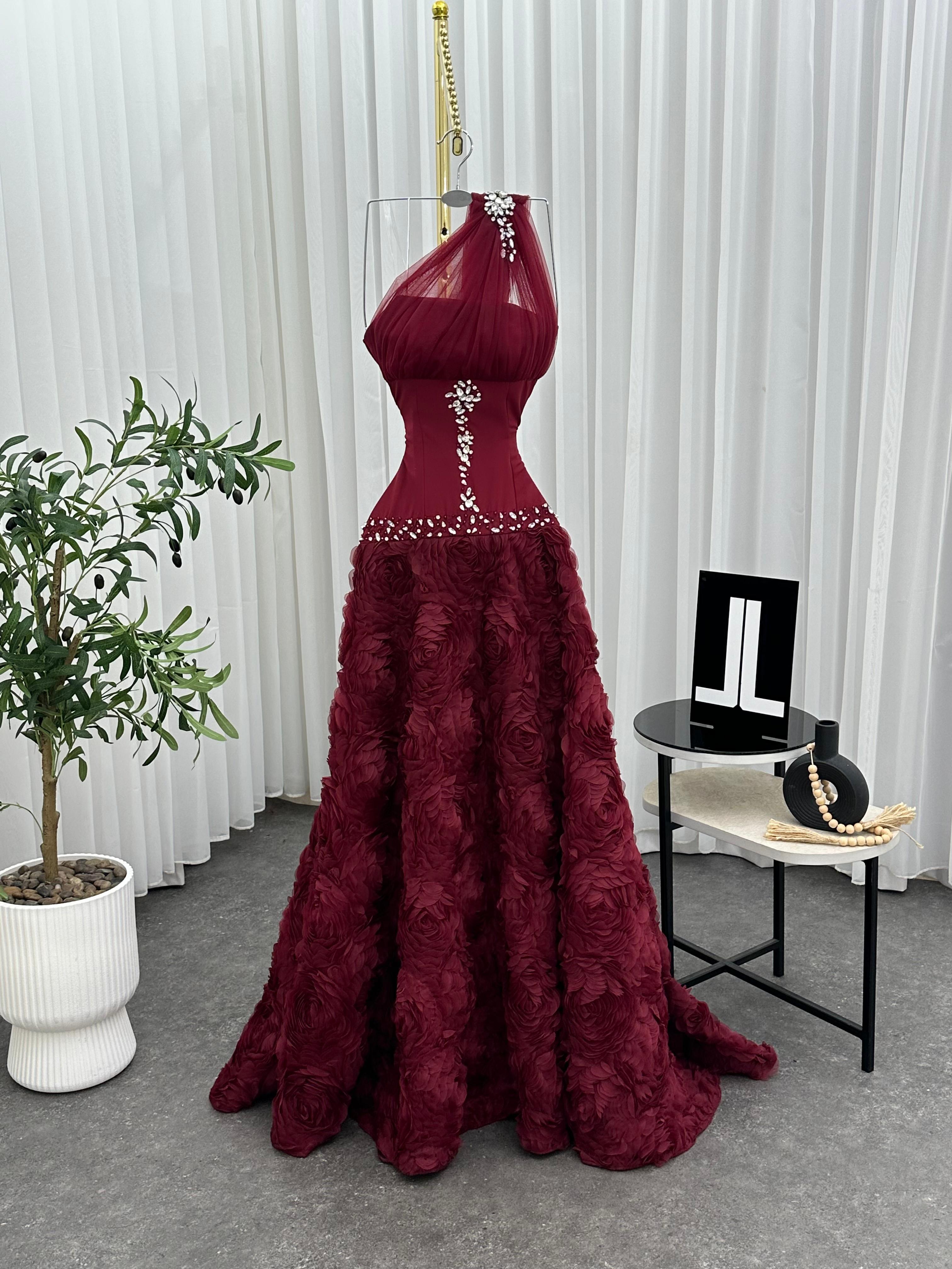 فستان ملكي بامتياز بتصميم أنثوي يخطف الأنظار بكل تفاصيله. يأتي بلون عنابي راقٍ بقصة ضيقة من الأعلى تُبرز جمال الخصر والكتف بأسلوب الكتف الواحد، ويُزيَّن بالتل الناعم المتقاطع أعلى الصدر لتوازن بين الأناقة والفخامة. التنورة مصممة بالكامل من قماش الورود الكلوش بكثافة ساحرة تمنح الفستان مظهرًا ثلاثي الأبعاد نابض بالفخامة والرقي.