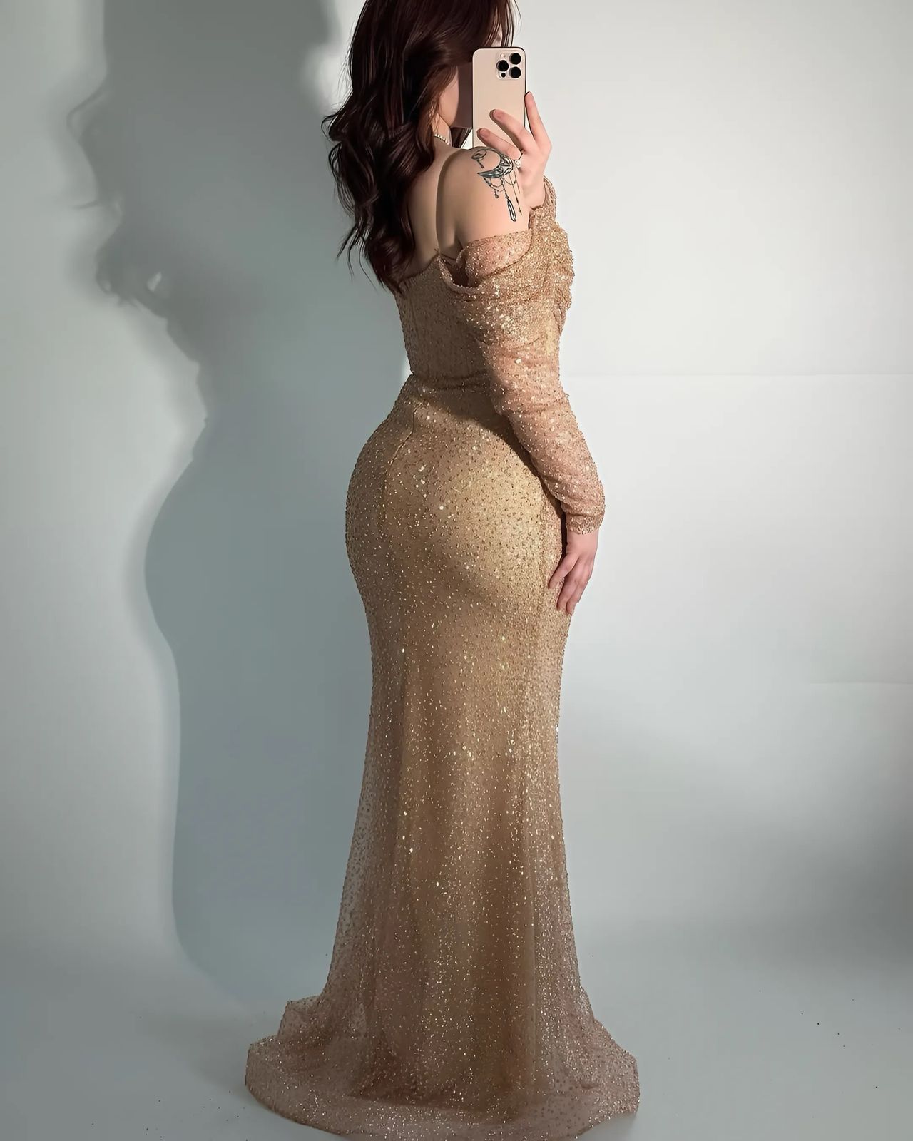 فستان الفخامة الذهبية: تألق ملكي بلمسات براقة