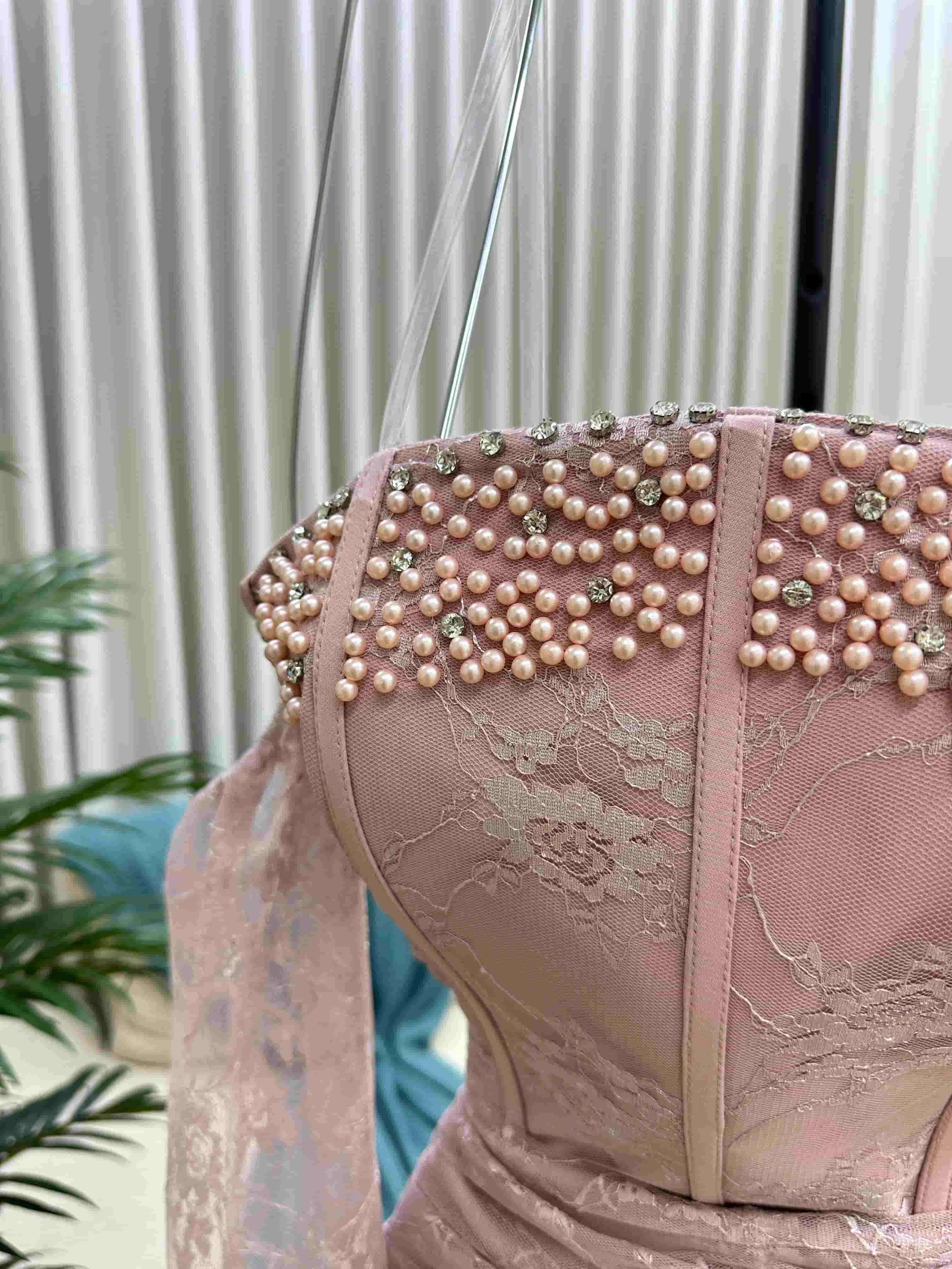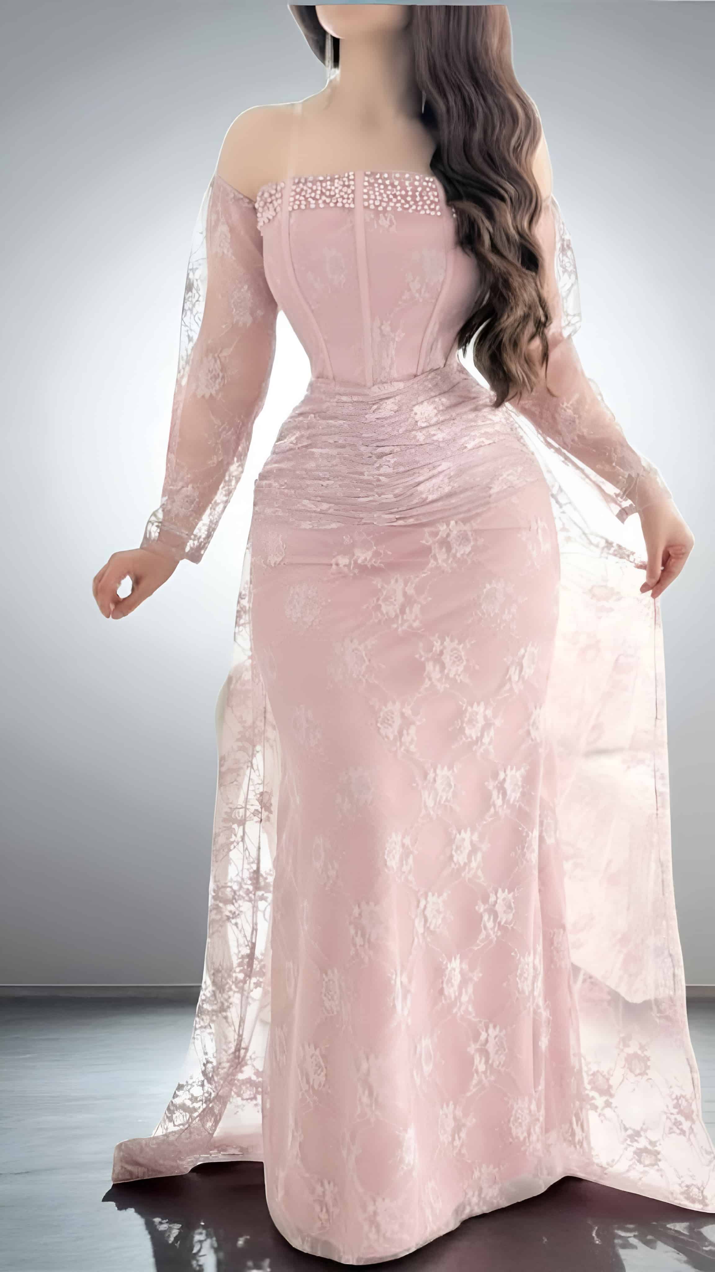 pink lace pearl beaded gown – off shoulder formal dress – luxury khaliji eveningwear – elegant party gown