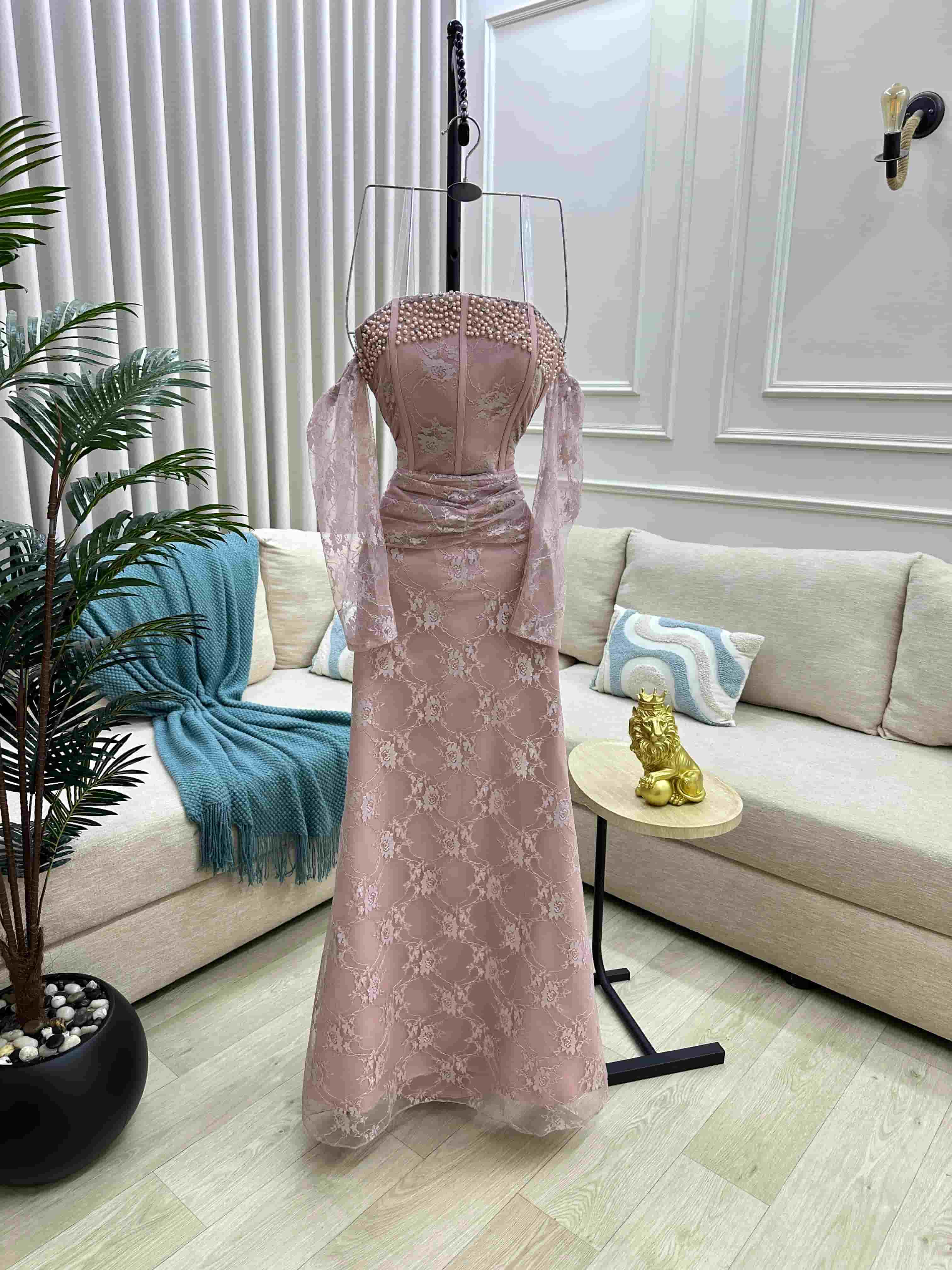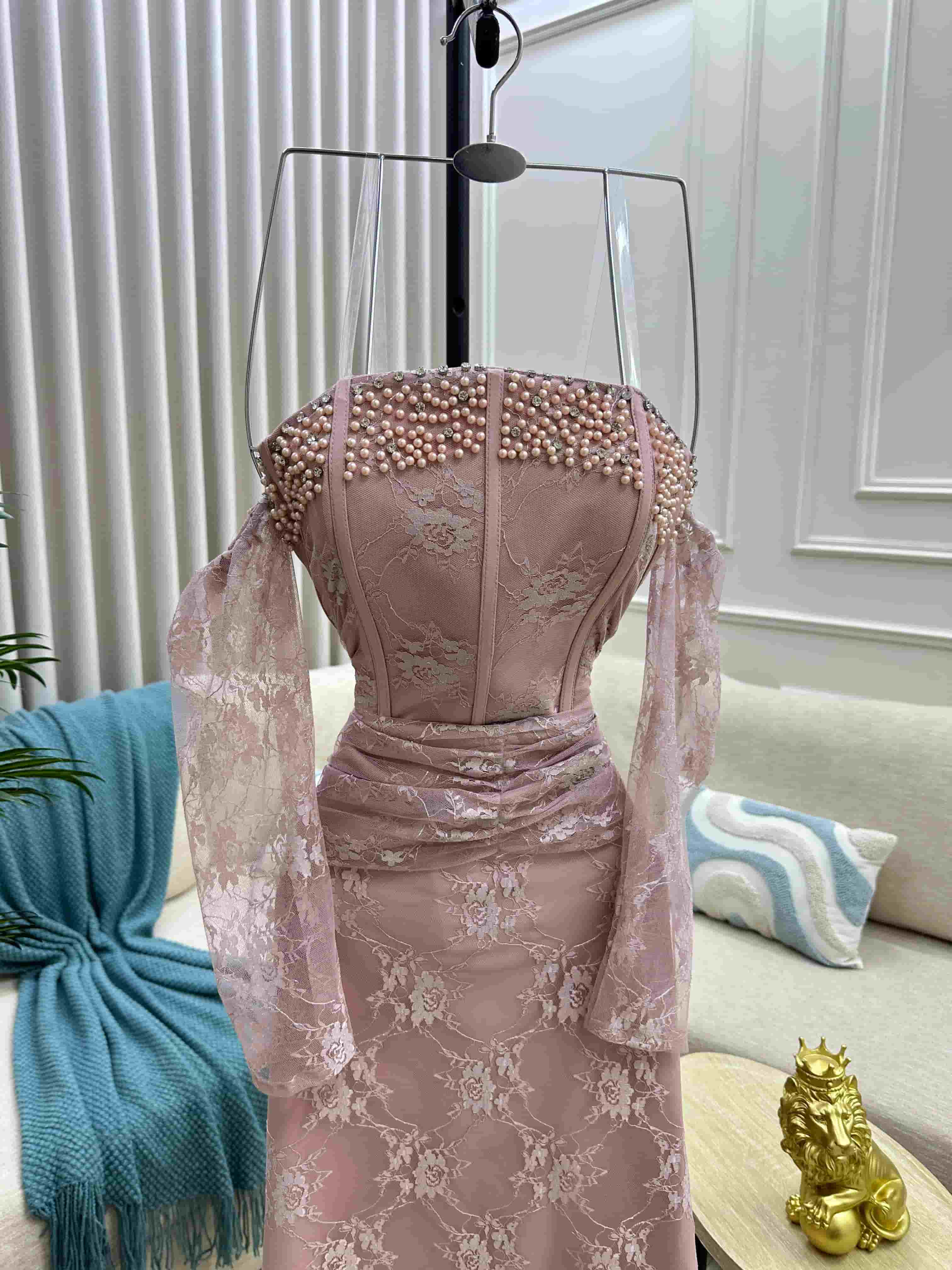 فستان سهرة طويل من الدانتيل الكوري الفاخر بتصميم أنثوي راقٍ يبرز جمال القوام. يتميز الصدر بكورسيه فاخر مزين بتطريز يدوي من اللؤلؤ والكريستال البراق بأسلوب أنيق وفخم، مع أكمام أوف شولدر من الدانتيل الشفاف تضيف لمسة رومانسية. القصة الانسيابية والتنورة الطويلة تمنح إطلالة ملوكية مثالية للمناسبات الخاصة.