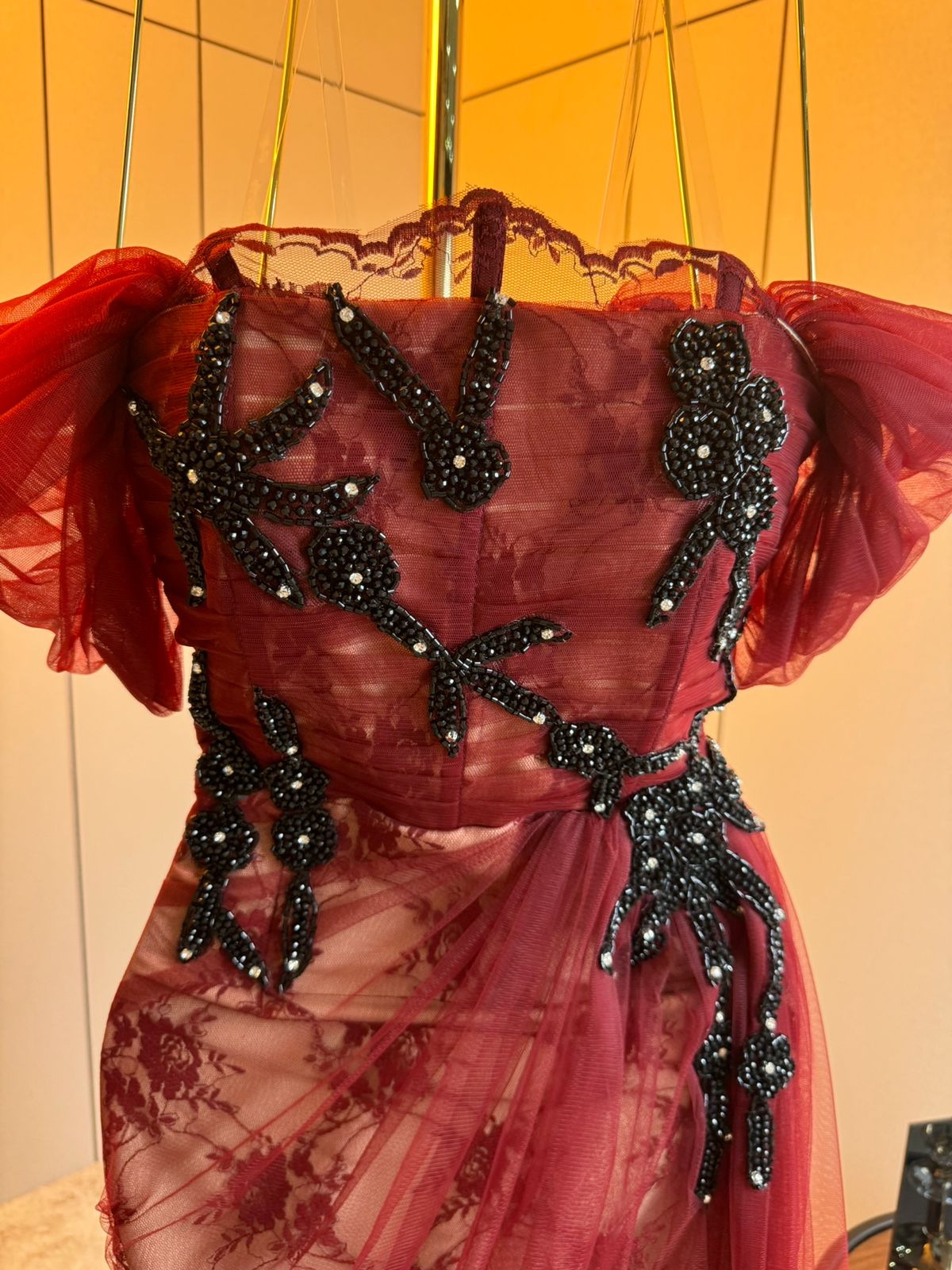 الصدرية المطرزة بإتقان تعزز جمال الفستان، بينما تضفي التفاصيل الدقيقة لمسة ملكية تخطف الأنظار!