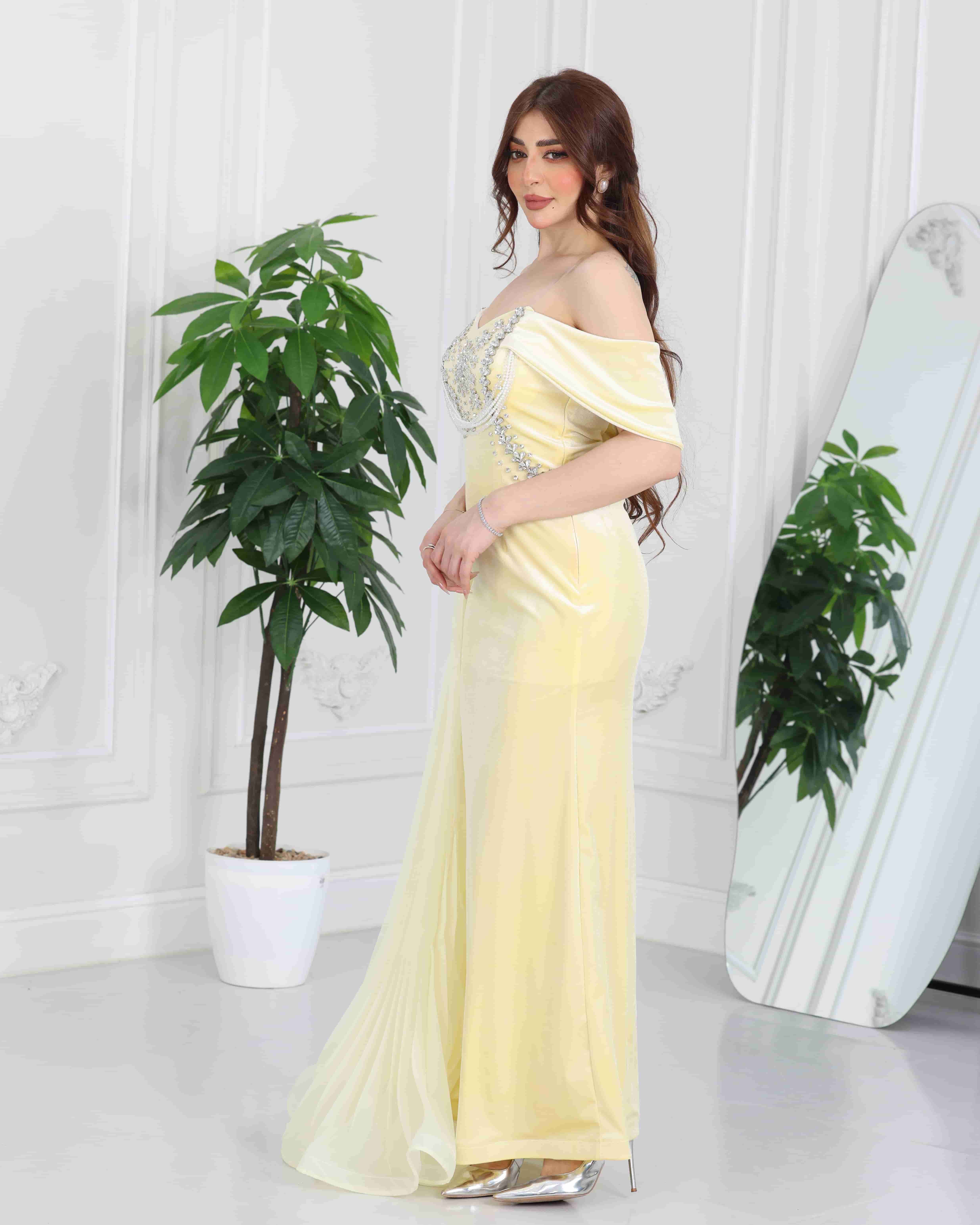 yellow velvet off shoulder gown – pearl beaded evening dress – elegant formal wear – khaliji luxury fashion