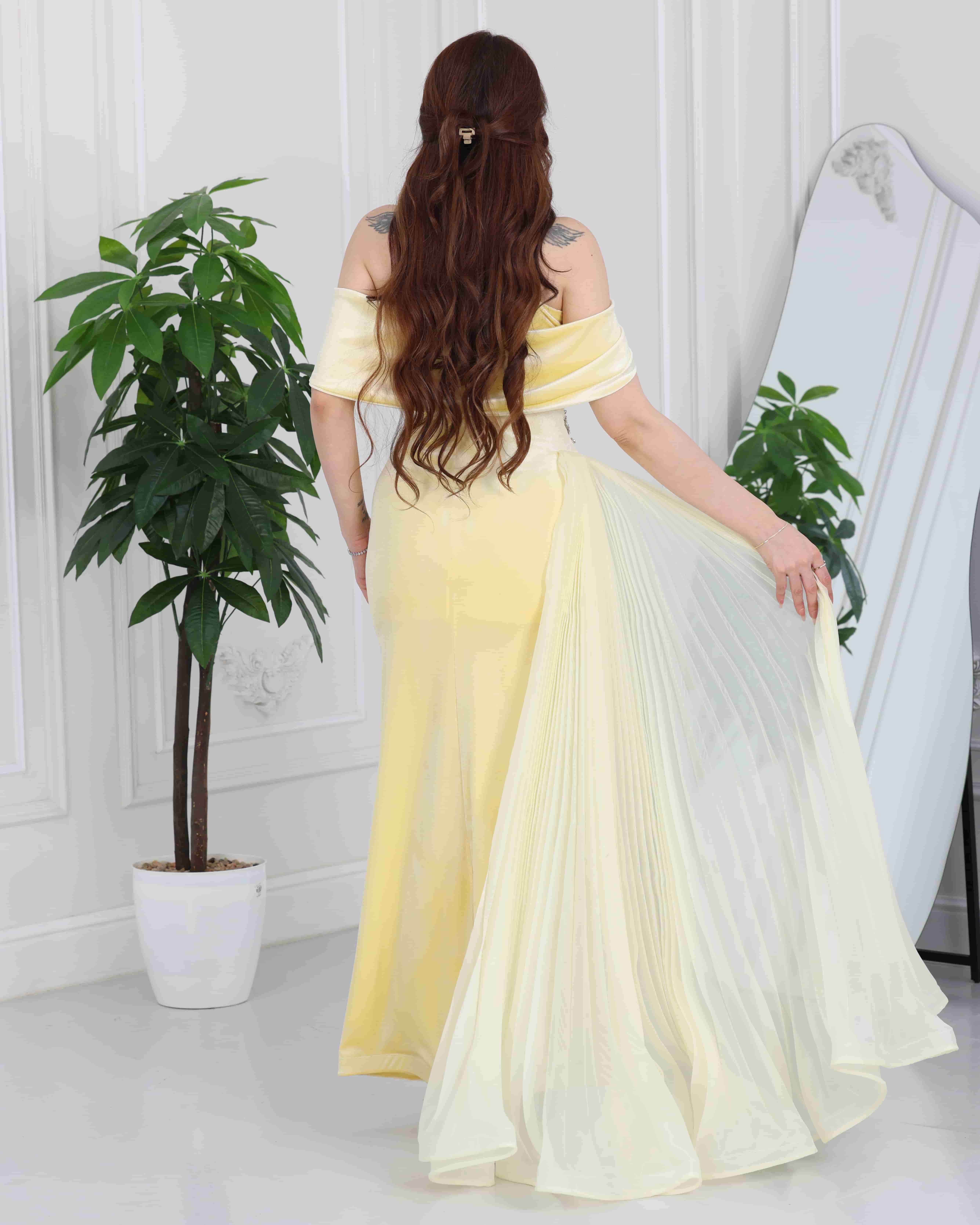 فستان سهرة أصفر طويل بتصميم راقٍ يناسب حفلات الخطوبة، المناسبات المسائية، وسهرات العيد والتخرج.