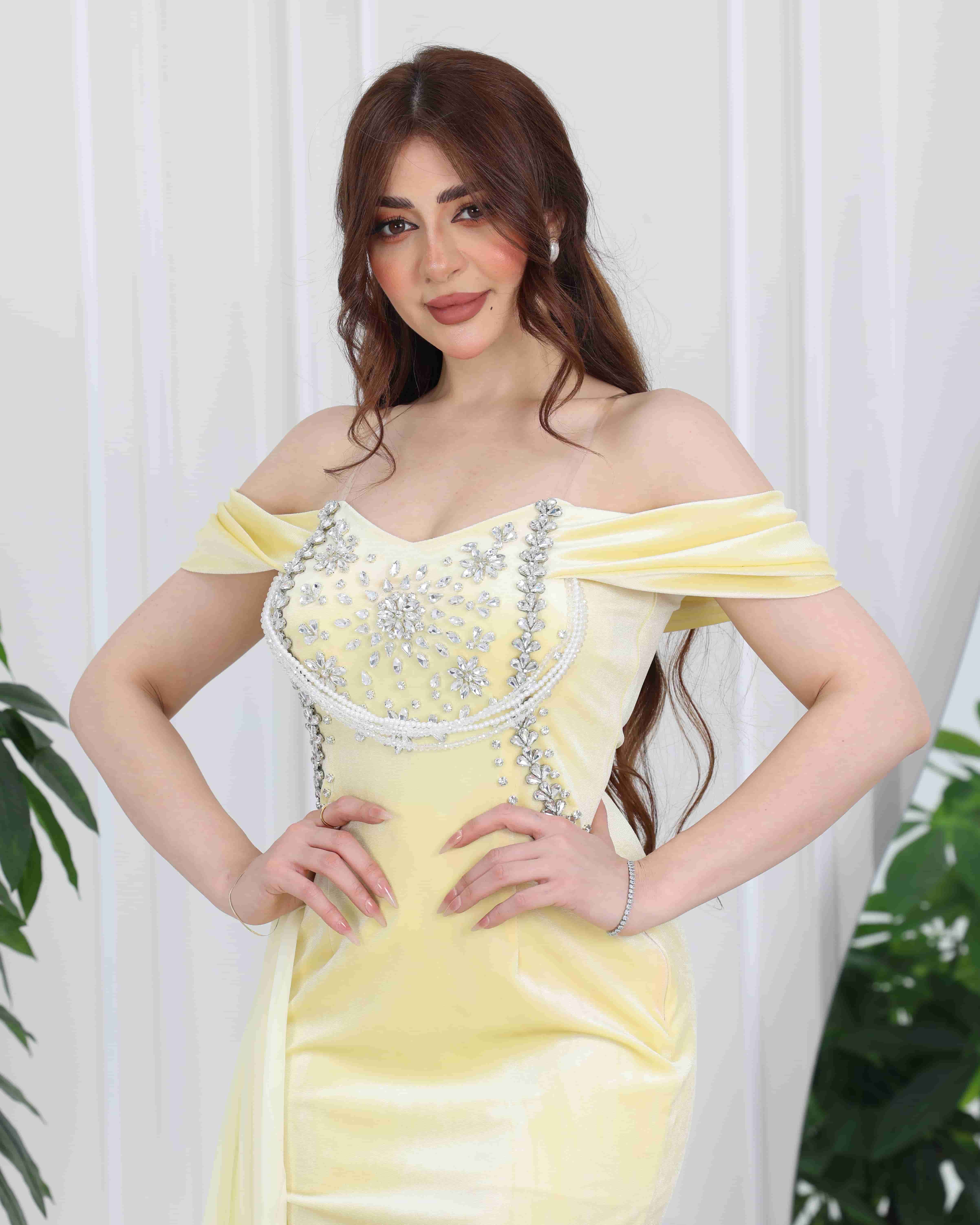 فستان سهرة طويل بتصميم فاخر يجمع بين الأناقة والأنوثة، مصنوع من قماش مخمل ناعم يمنح لمعة جذابة وحضورًا لافتًا. يتميز بقصة أوف شولدر مع تطريز فاخر من اللؤلؤ والكريستال على منطقة الصدر ليضفي مظهرًا ملكيًا راقيًا. تنورة الفستان منسدلة بانسيابية ناعمة مع طبقة بليسيه جانبية تضيف حركة أنيقة ورقيًا في الإطلالة.