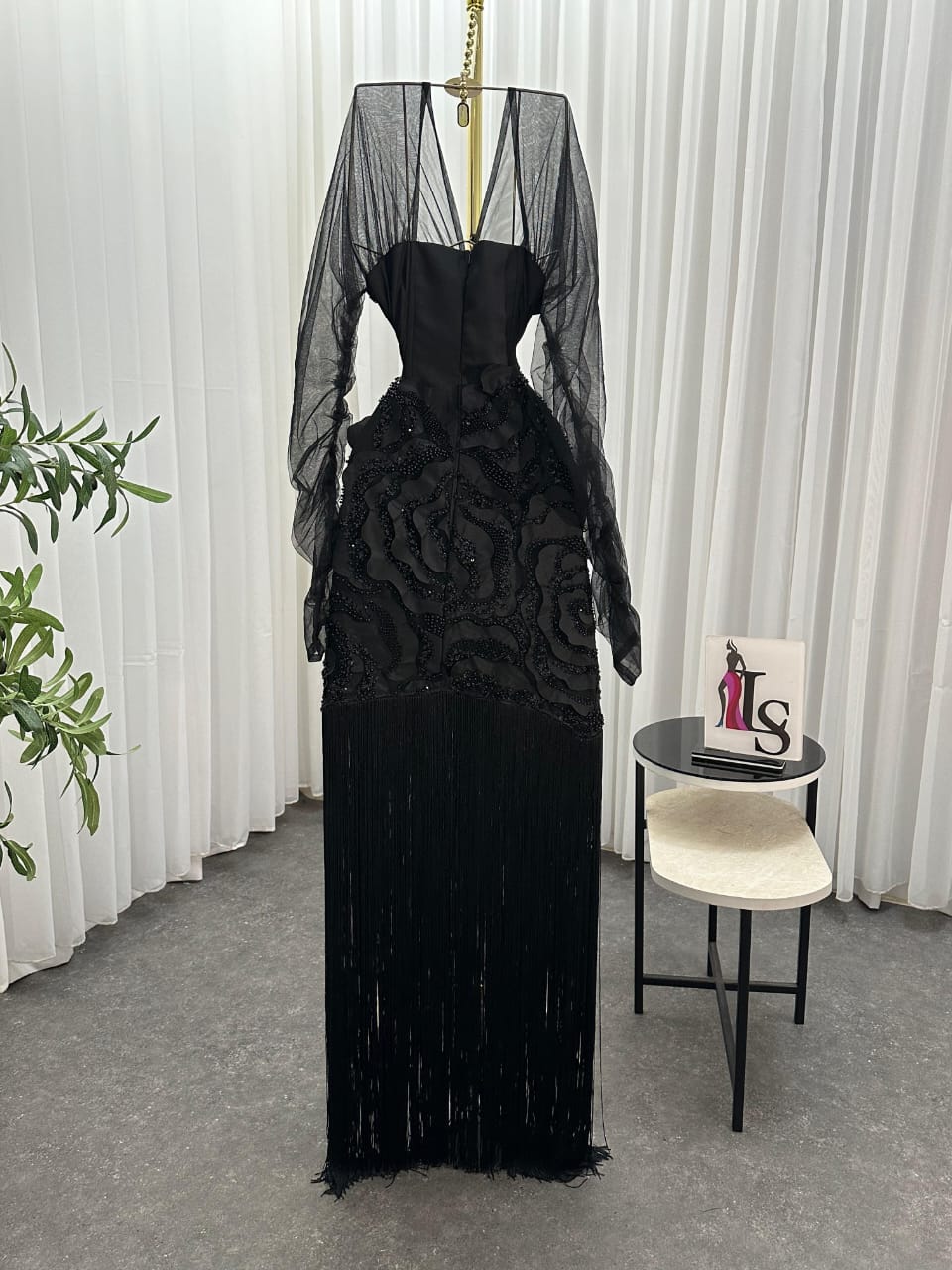 Black barbie evening gown – long sleeve sheer dress – embroidered floral gown – fringe maxi dress – khaliji style evening wear – luxury party gown – Saudi fashion formal dress – designer black gown – elegant women’s evening outfit.