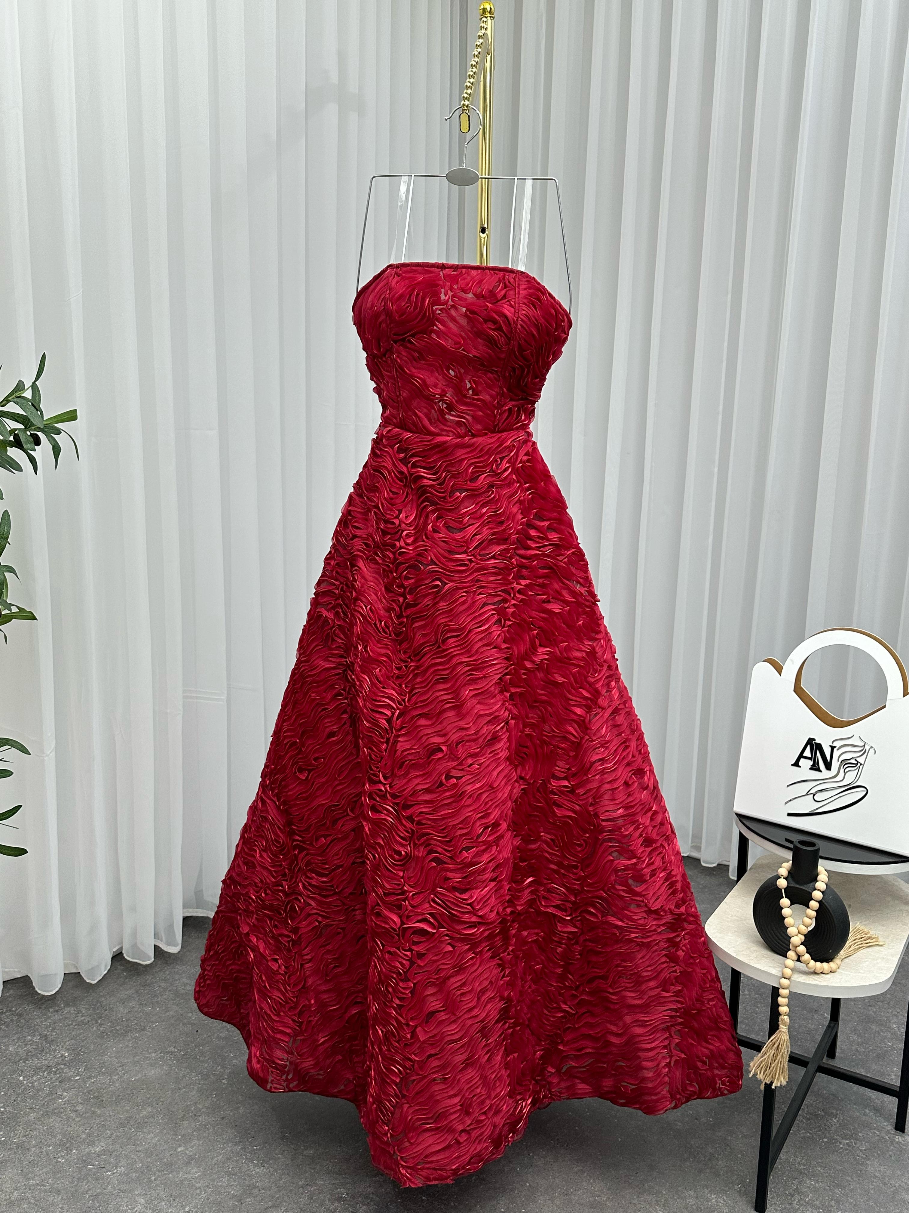 Red textured gazar evening dress – bold formal wear – strapless party gown – khaliji luxury look