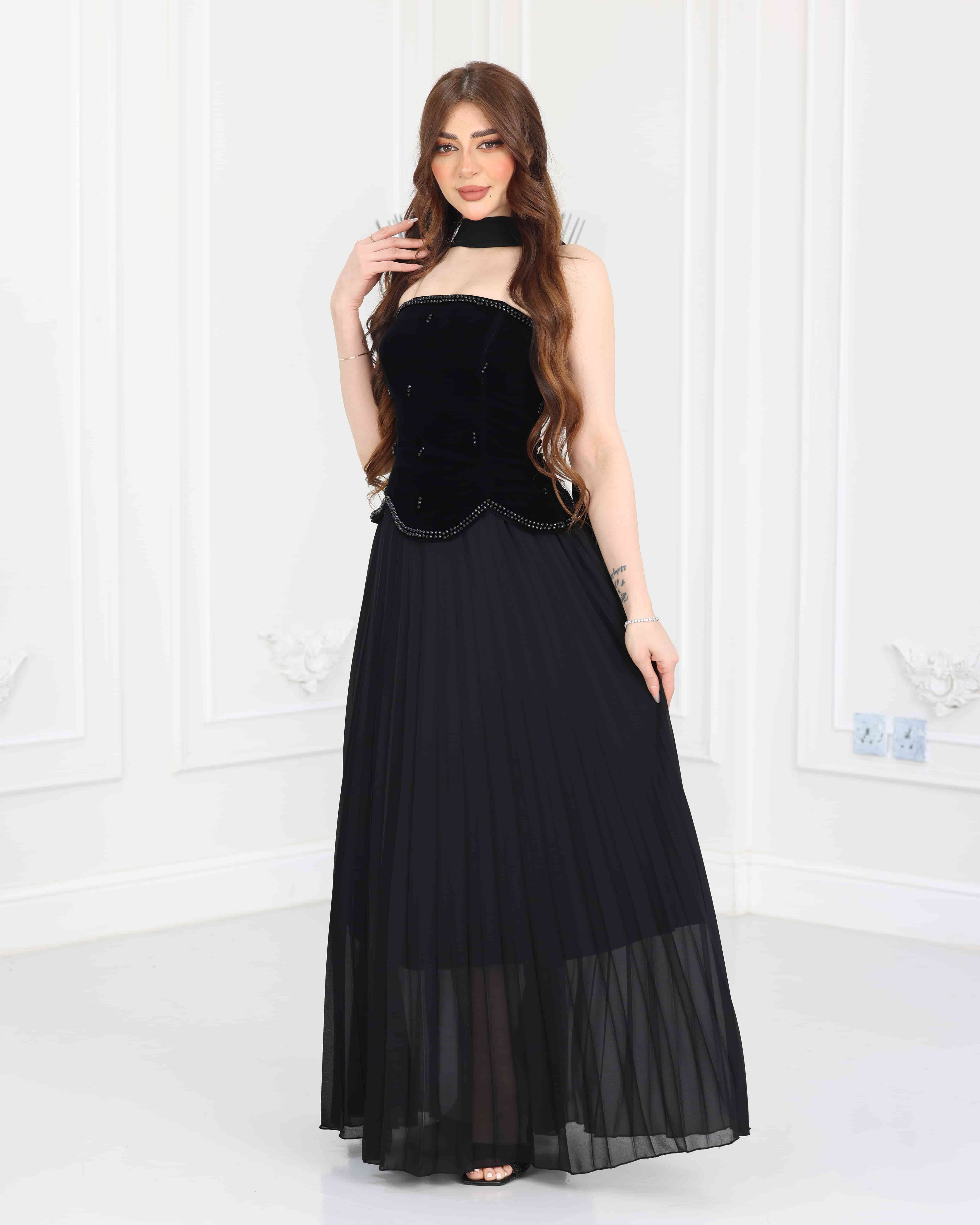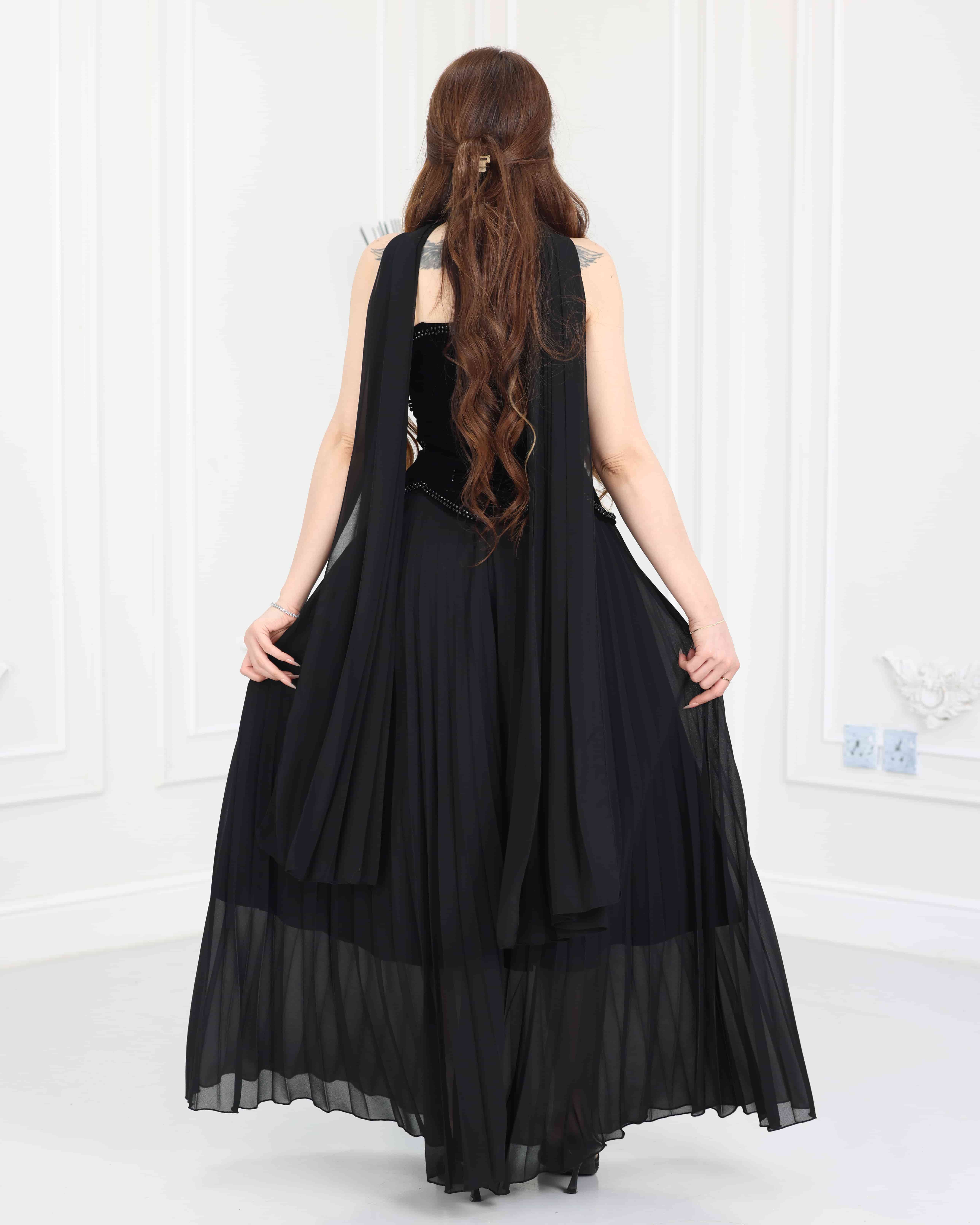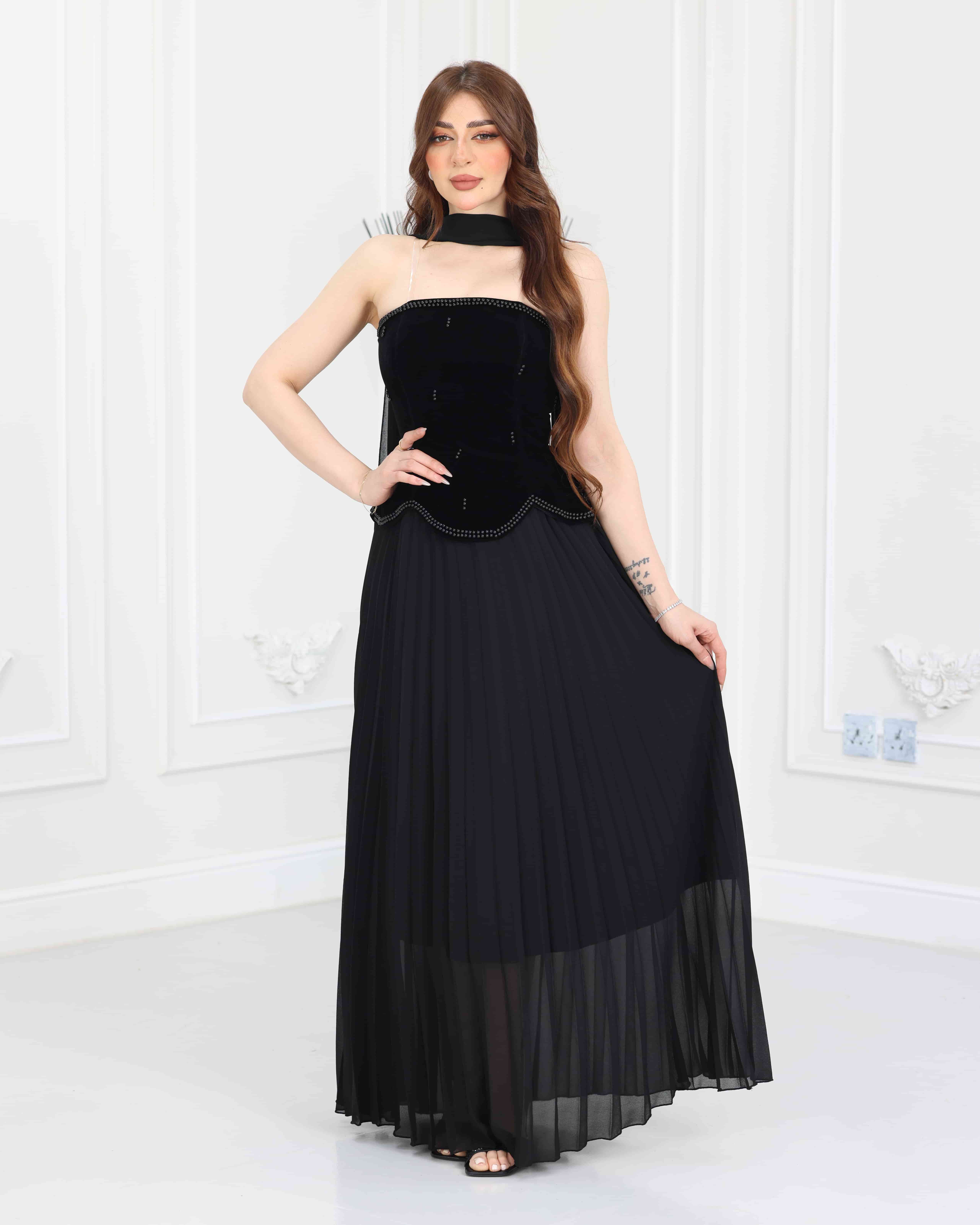 black velvet chiffon pleated dress – elegant evening gown – formal khaliji style – luxury soft fashion