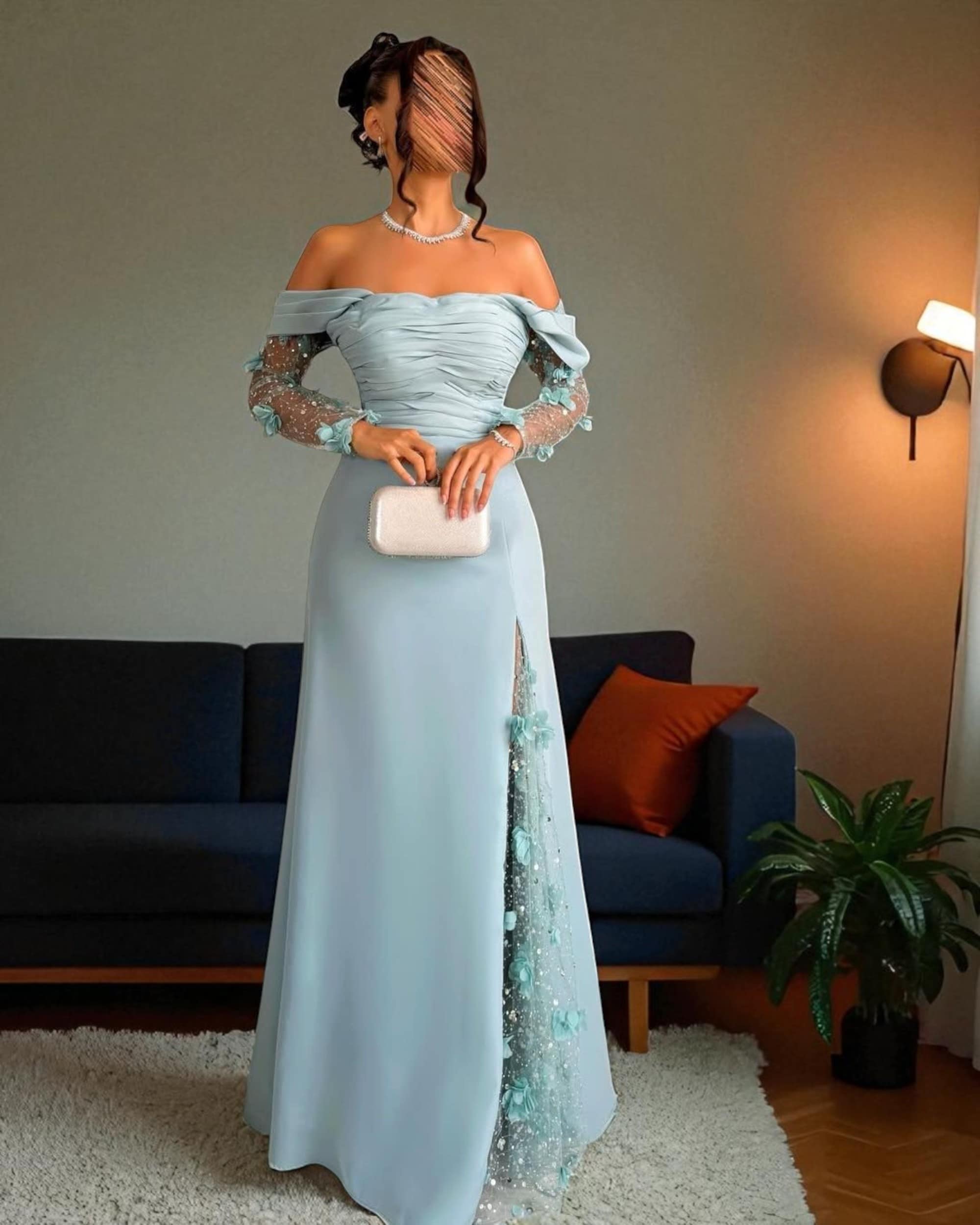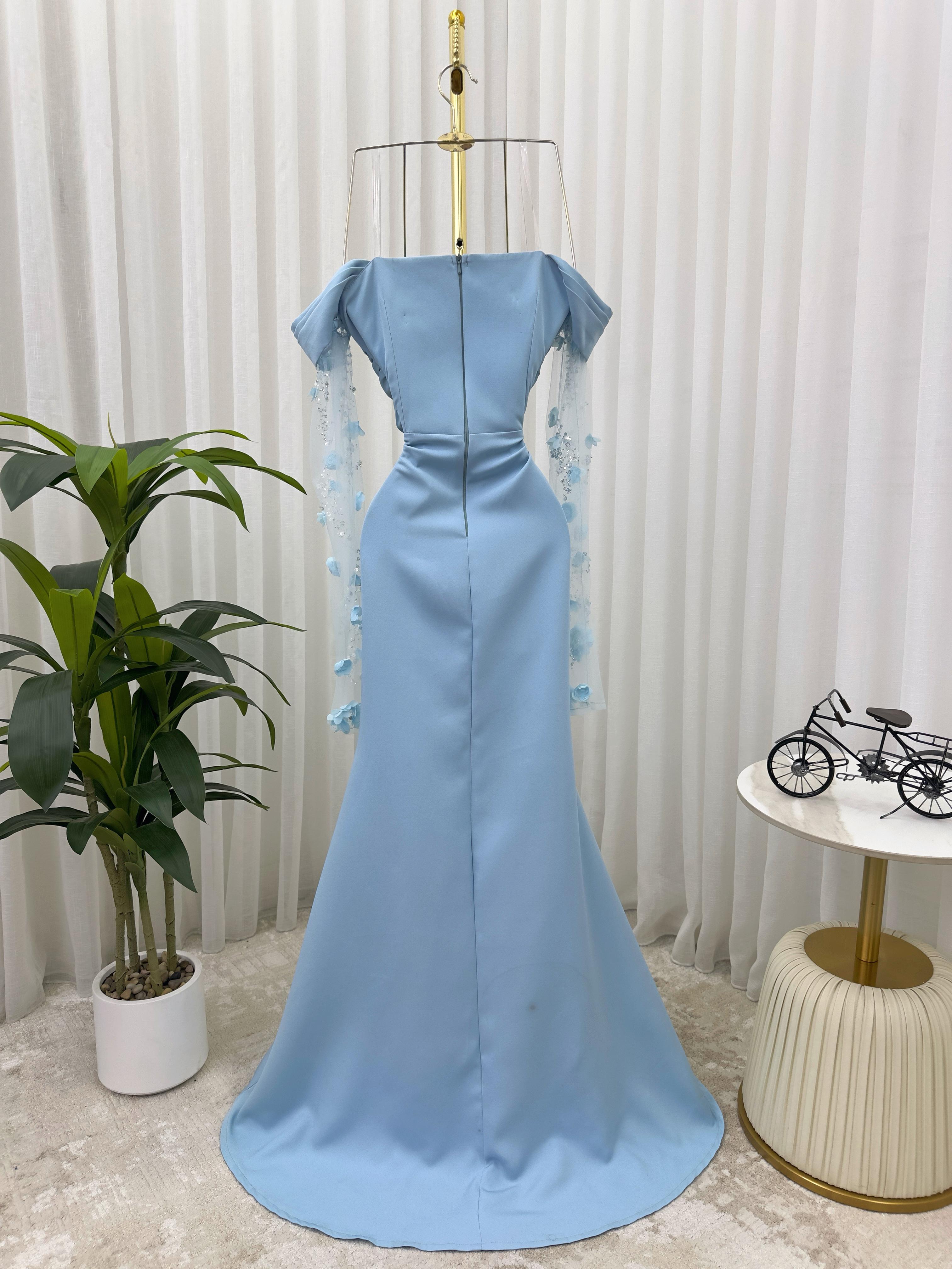 off shoulder blue barbie dress – floral embroidered gown – slit evening dress – khaliji style formal wear.