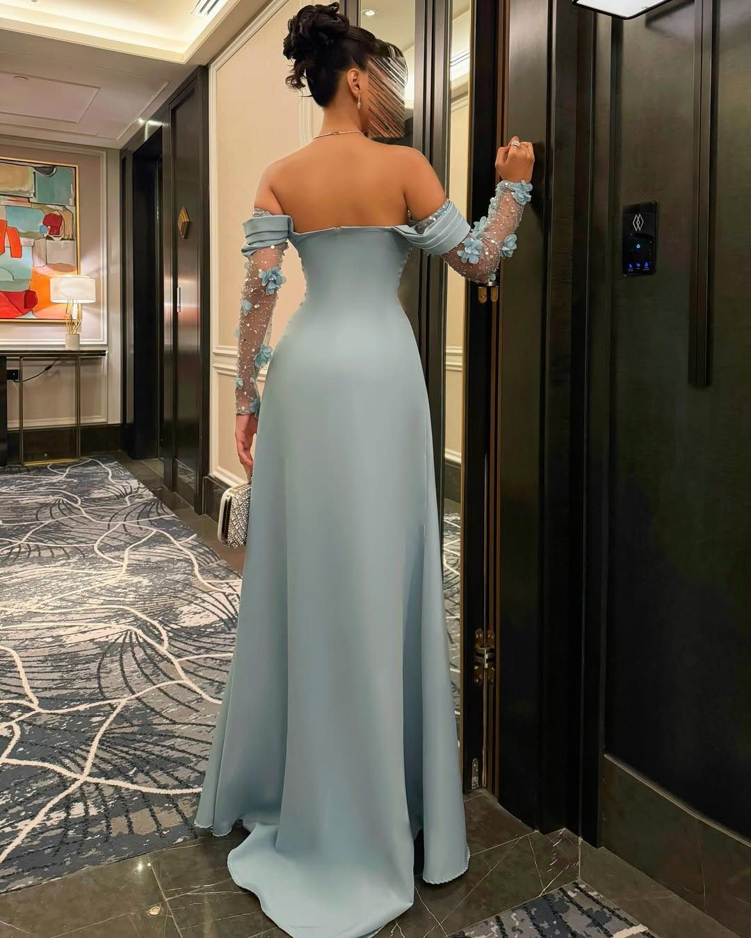 فستان سهرة ملكي طويل مثالي لحفلات الخطوبة، مناسبات العيد، حفلات العشاء، وسهرات التخرج. يندرج ضمن فساتين سهره ناعمه، فساتين ناعمة، فساتين طويلة، فساتين كم طويل، كم كت، فساتين سهرة طويلة 2025، فساتين فخمة، فساتين ملكية، فساتين مناسبات، فستان سهره ملكي، evening gown Saudi.