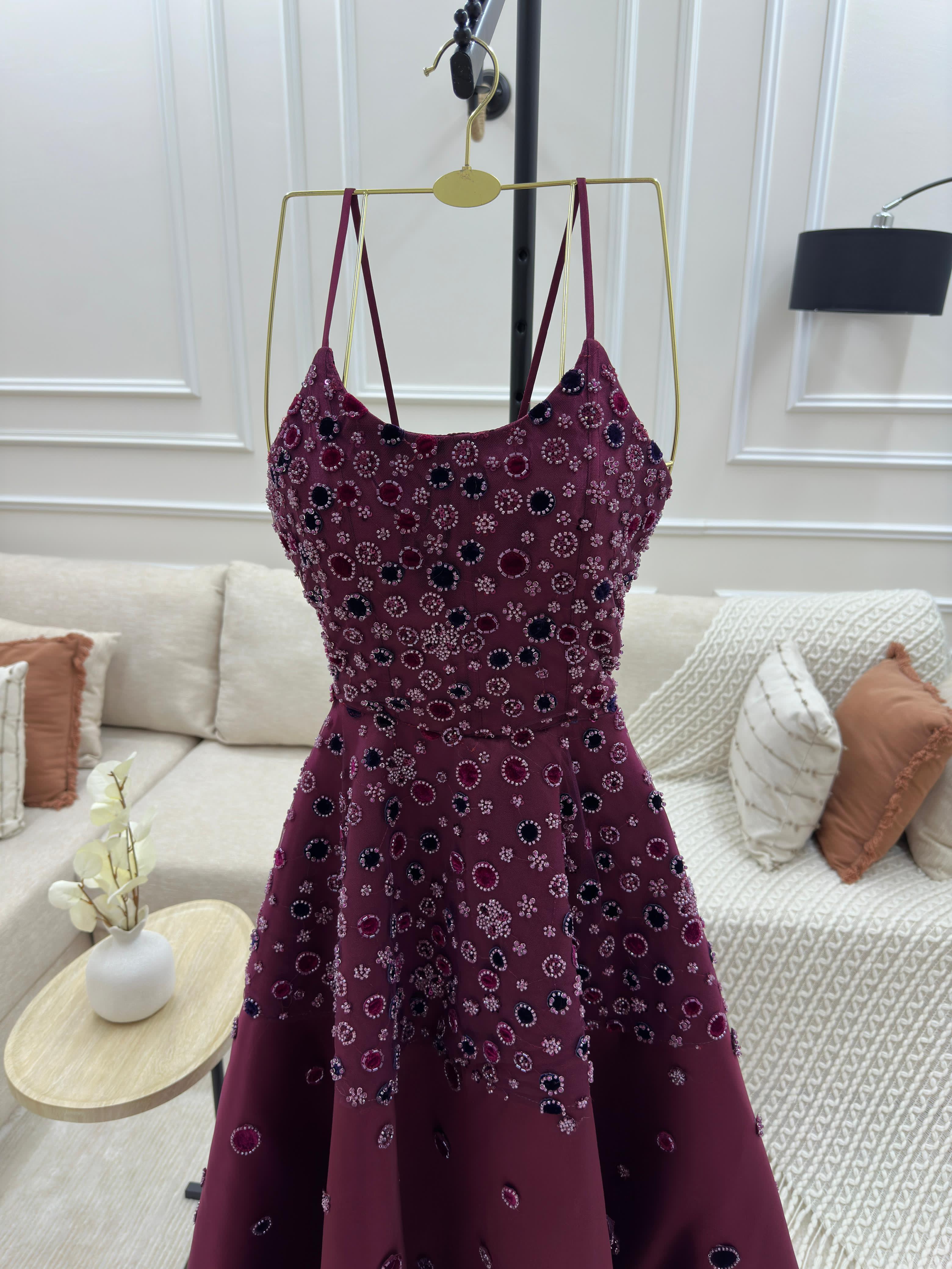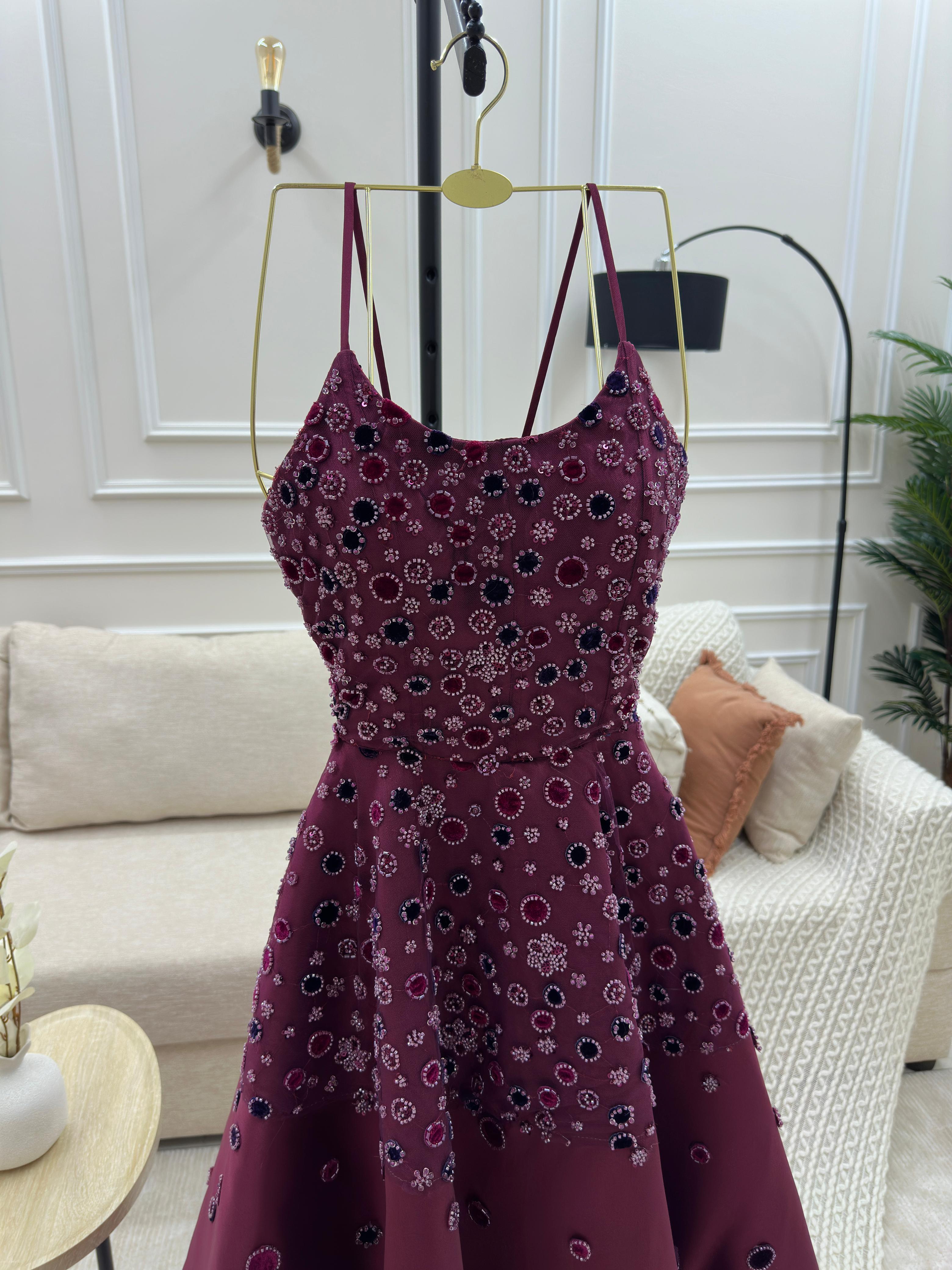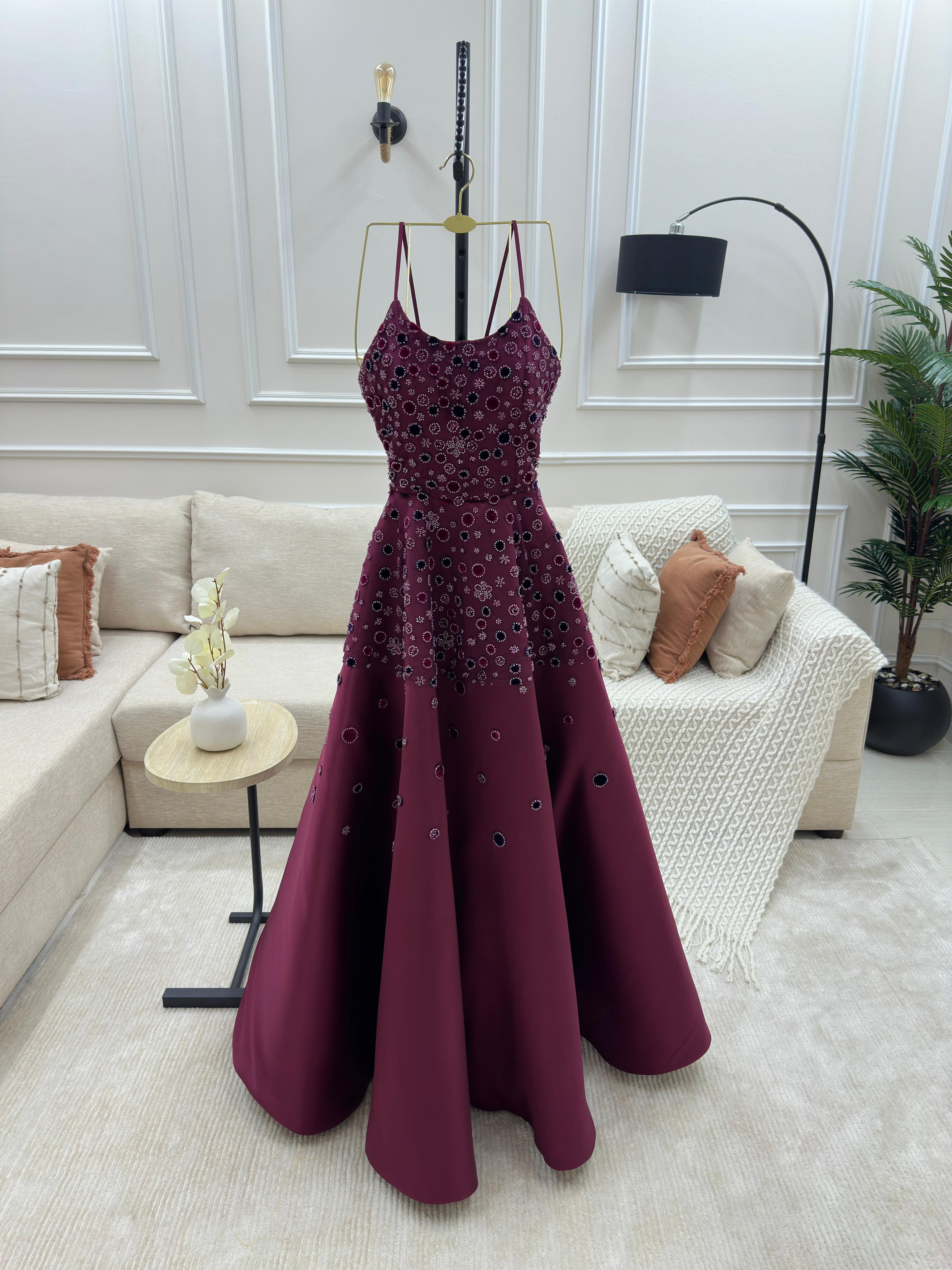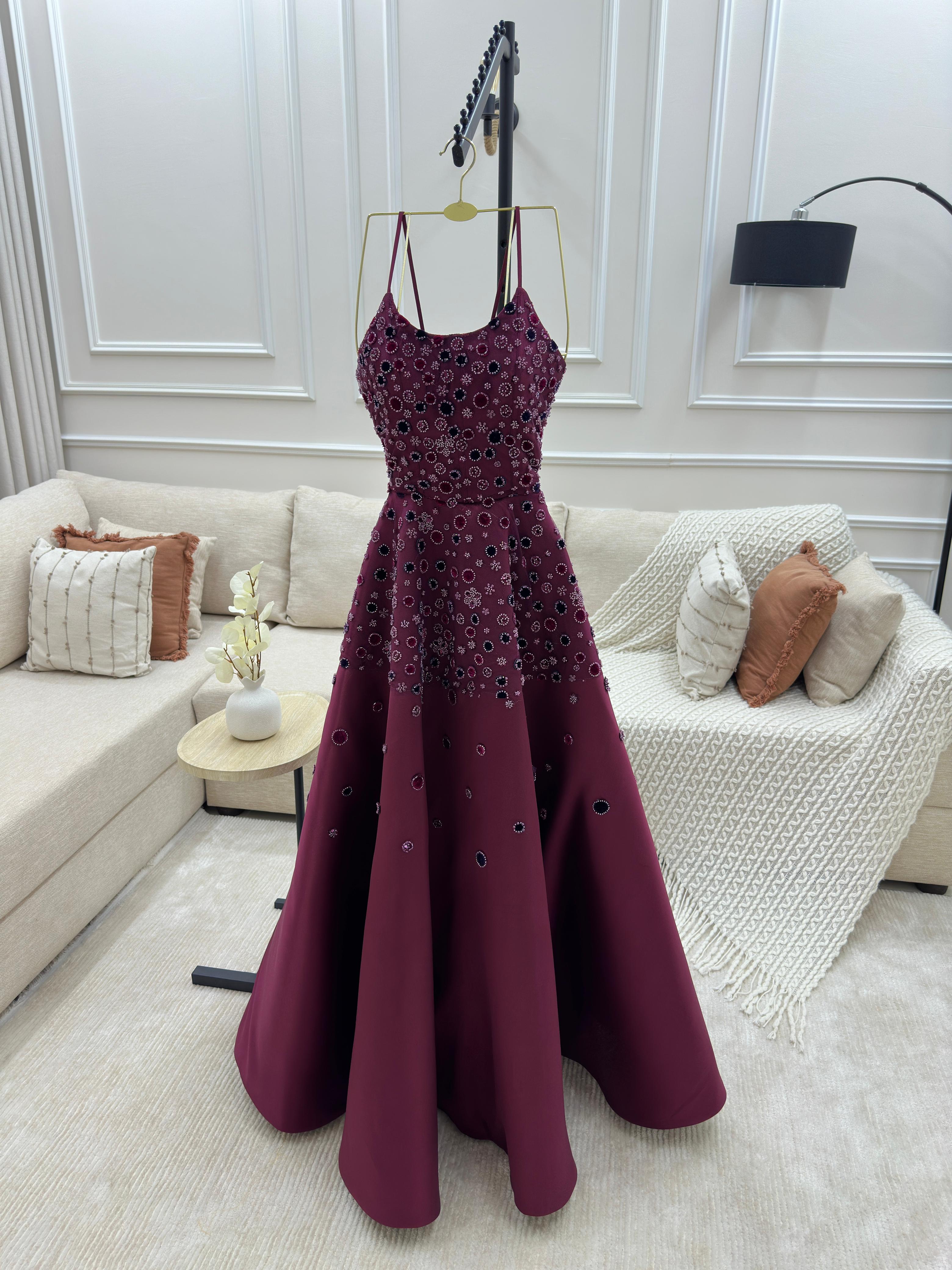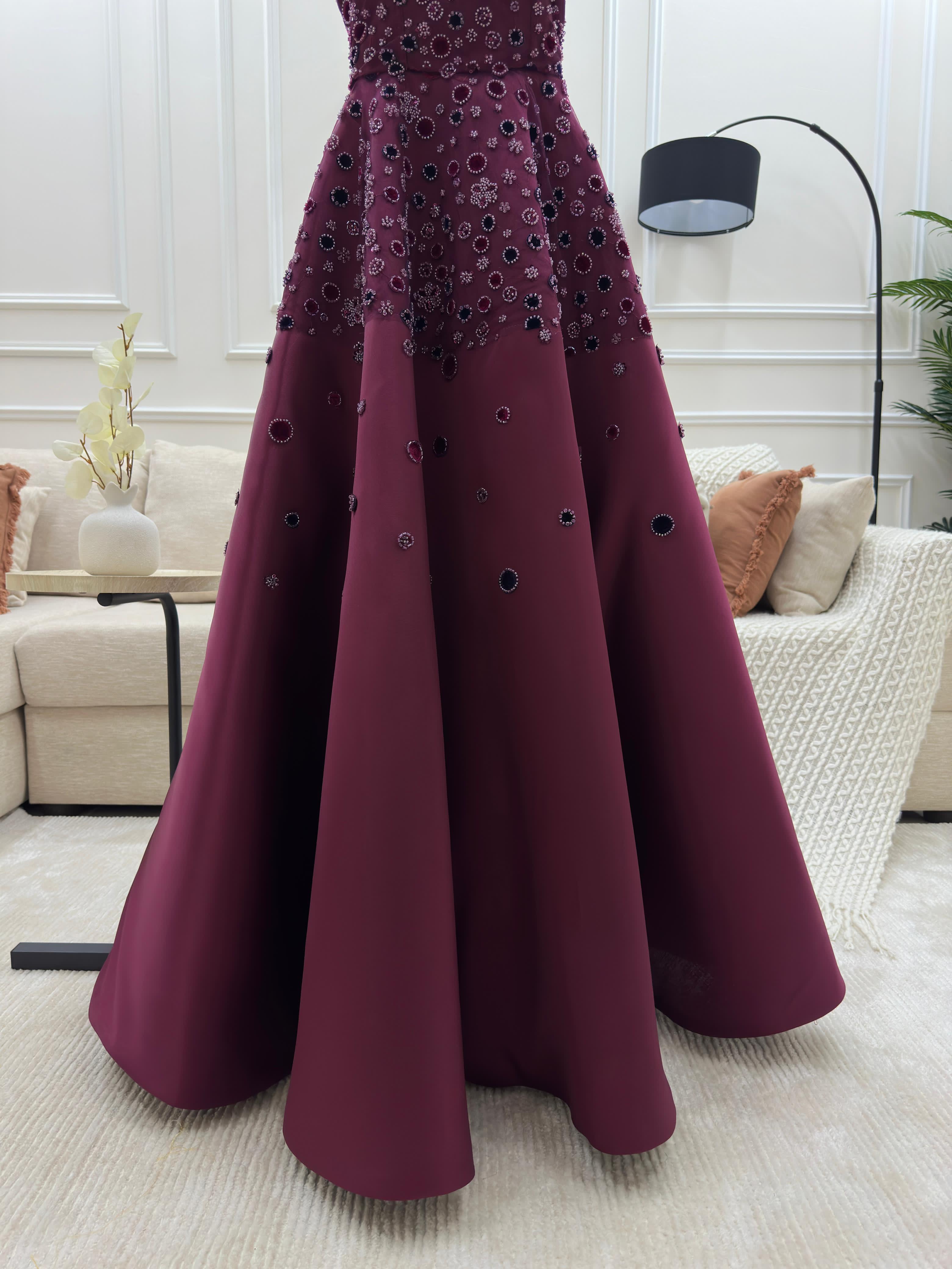 يتميز هذا الفستان المصنوع من الميكادو الفاخر بتصميم يجمع بين الفخامة والرقي. تأتي الصدرية بتطريز دائري متقن يضفي لمسة من الأناقة، بينما تضفي التنورة الواسعة ذات القصة المنسدلة حركة جذابة تعزز الإطلالة الملكية. أما التفاصيل المطرزة المنتشرة على القماش، فهي تمنح الفستان طابعًا متوازنًا بين الفخامة والانسيابية، مما يجعله خيارًا مثالياً للمناسبات الفاخرة والسهرات الخاصة.