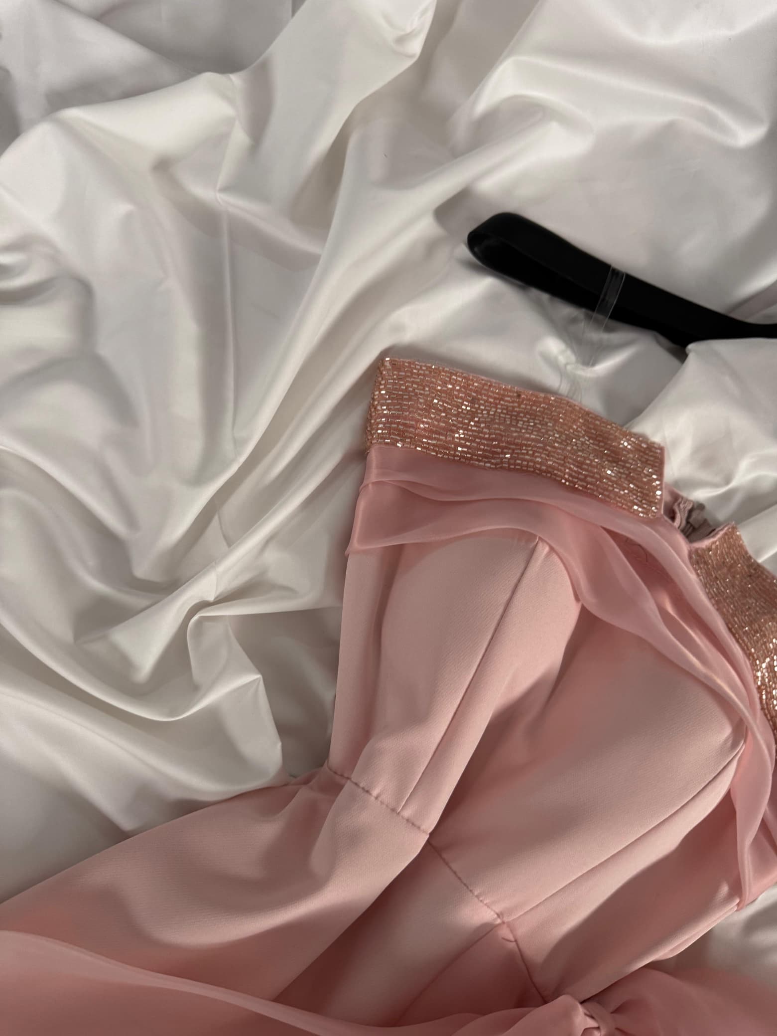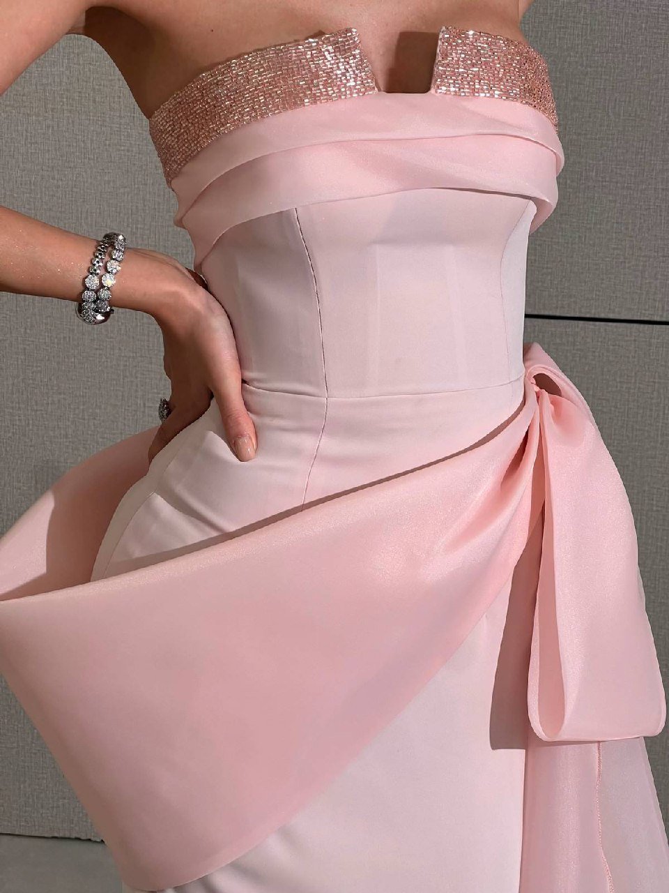 👜 الحقيبة: أضيفي كلاتش مرصّعة بألوان ناعمة لتكملي الإطلالة الراقية.