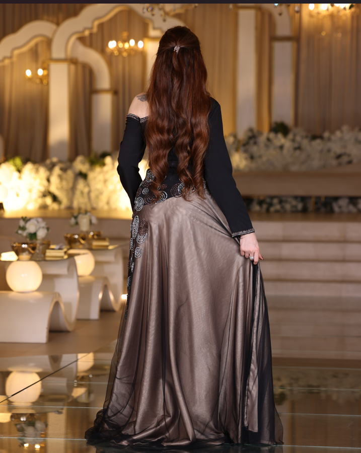 فستان سهرة فاخر بلون أسود مطرز بتصميم أنثوي، مثالي للسهرات، حفلات الخطوبة، تصوير المناسبات، واللقاءات المسائية الراقية. يناسب الذوق الخليجي لمحبات الفساتين الفخمة ذات التطريزات الملفتة والأكمام الطويلة.