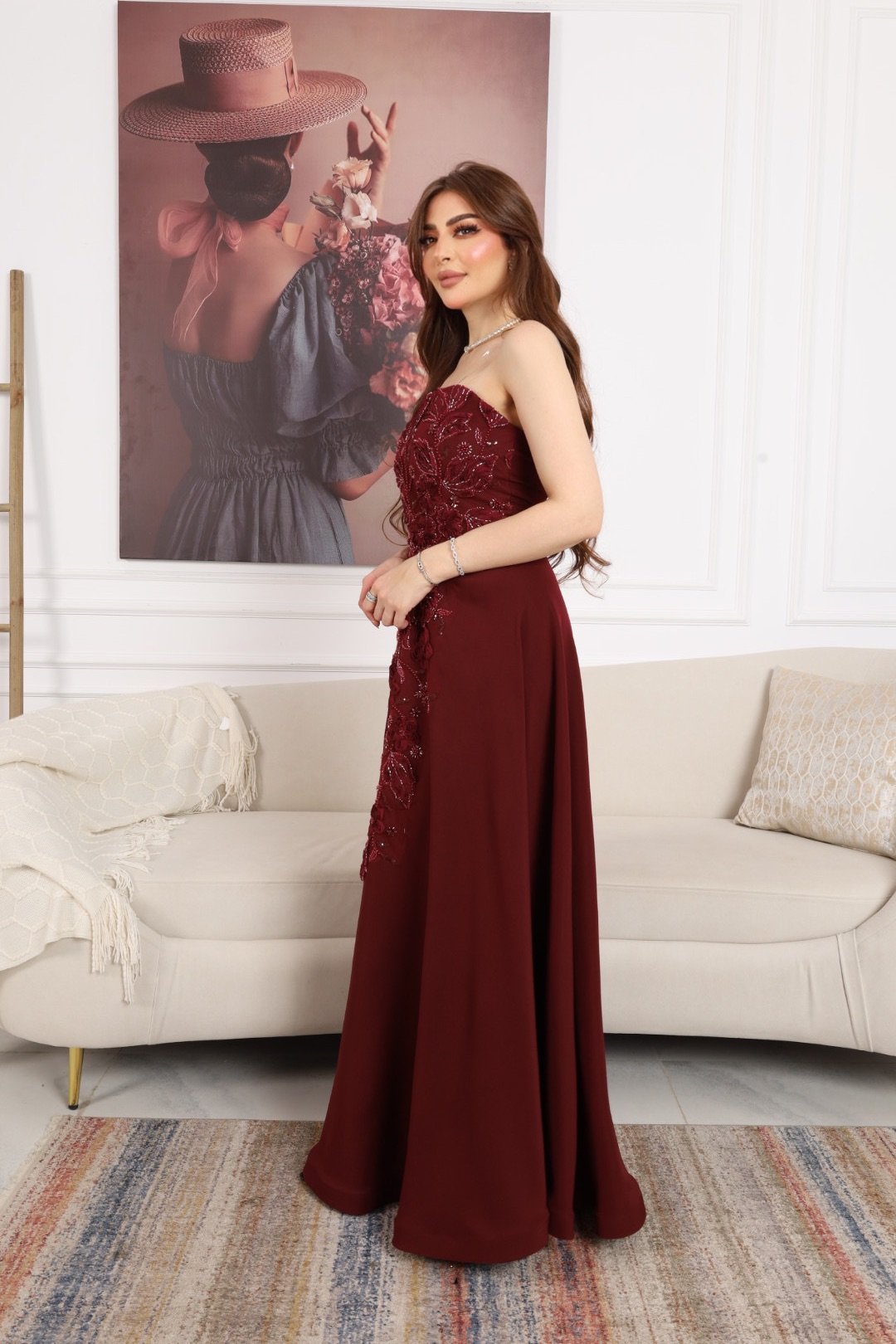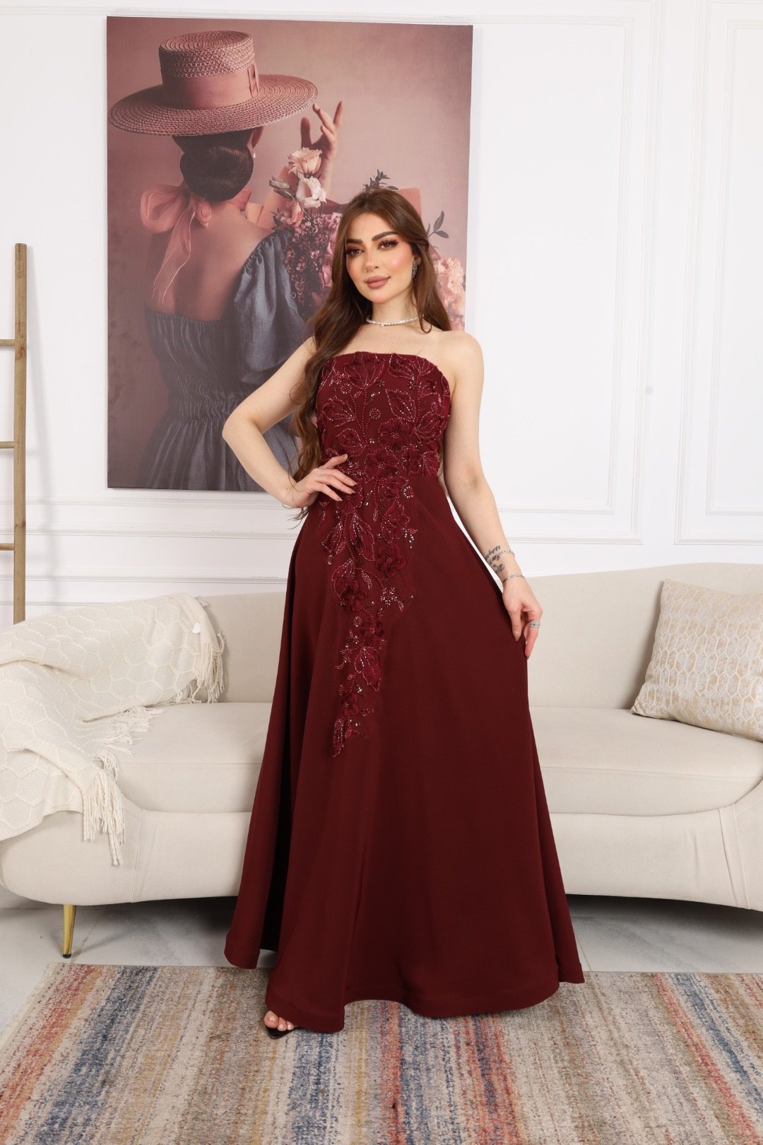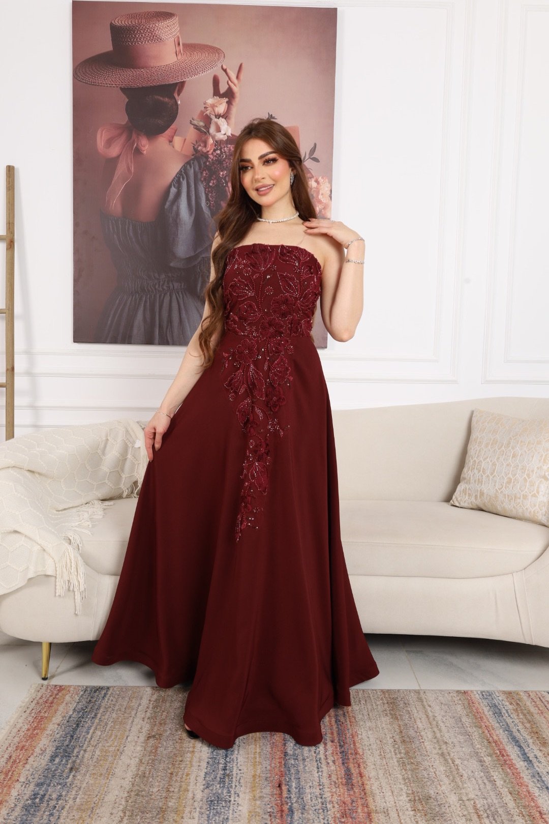 فستان سهرة ملكي بتصميم ناعم وبلمسة فاخرة، يأتي بلون عنابي أنثوي راقٍ. الجزء العلوي مصمم بدون أكتاف (سترابلس) من قماش الباربي الفاخر، ومزين بالكامل بتطريز يدوي بارز على شكل ورود فخمة وأوراق متداخلة، يمتد بانسيابية نحو التنورة ليمنحك مظهرًا متوازنًا وجاذبية لافتة. القصة الانسيابية للتنورة تضيف لمسة من الرقي والحضور المميز في كل مناسبة.